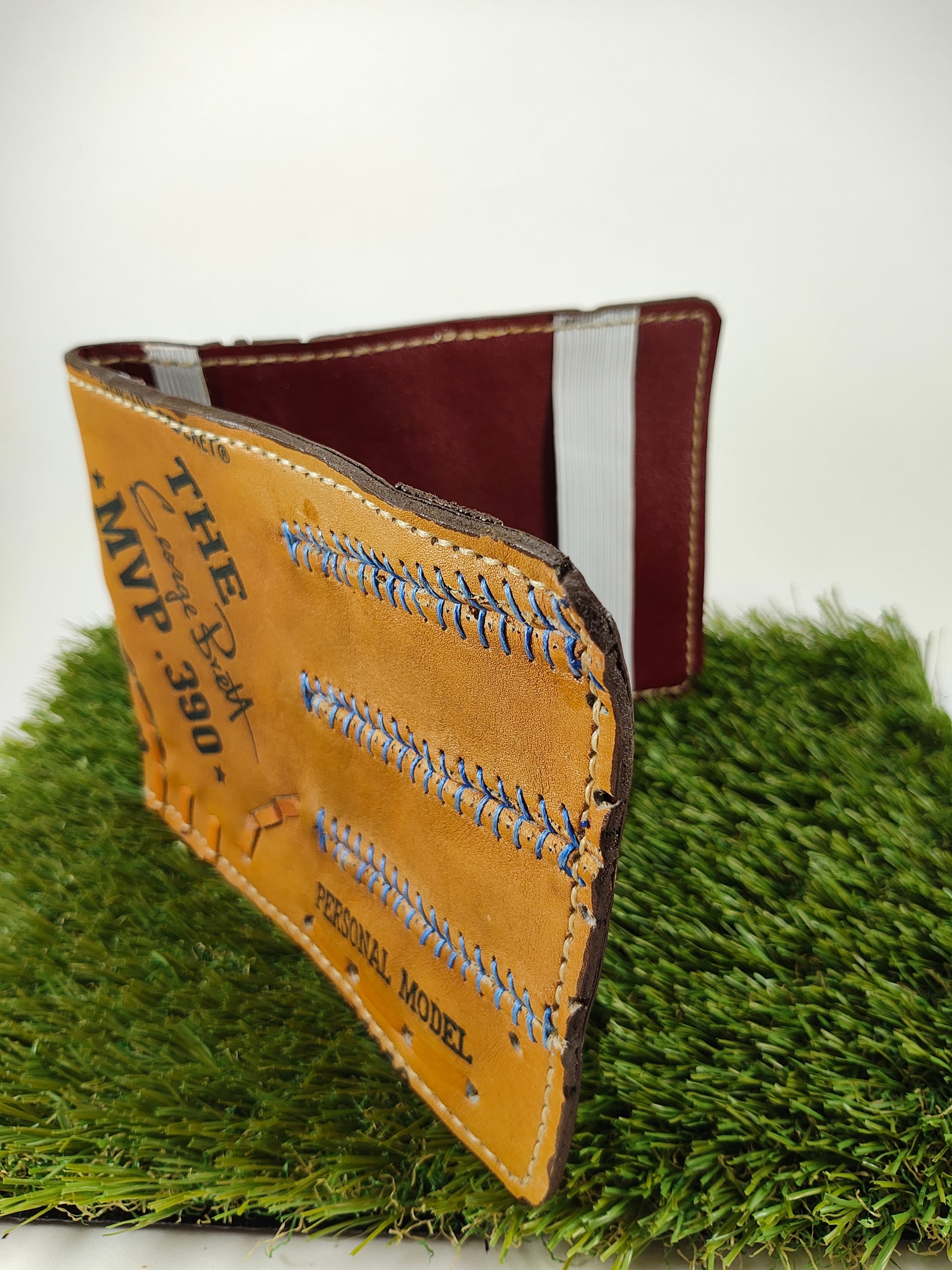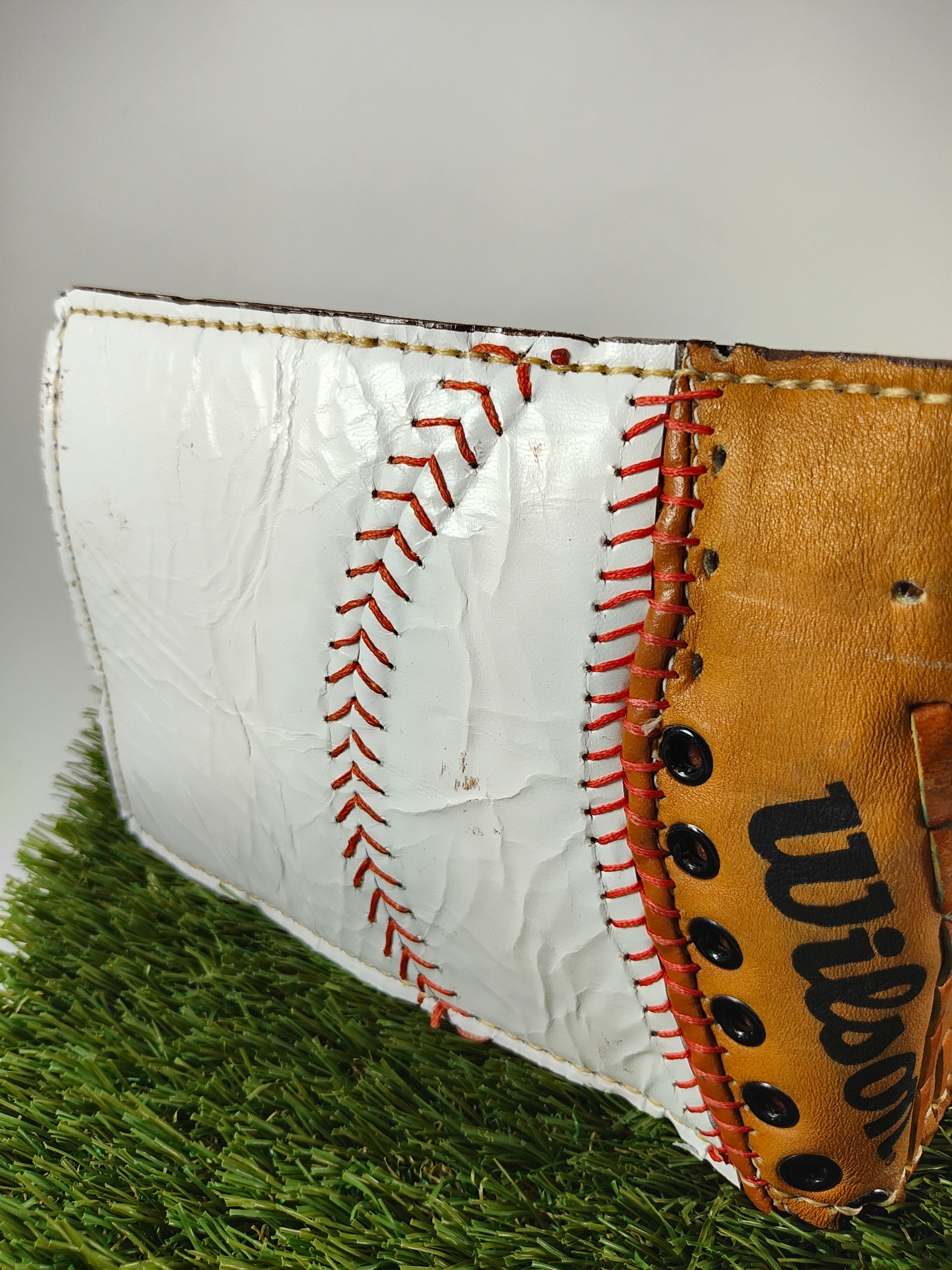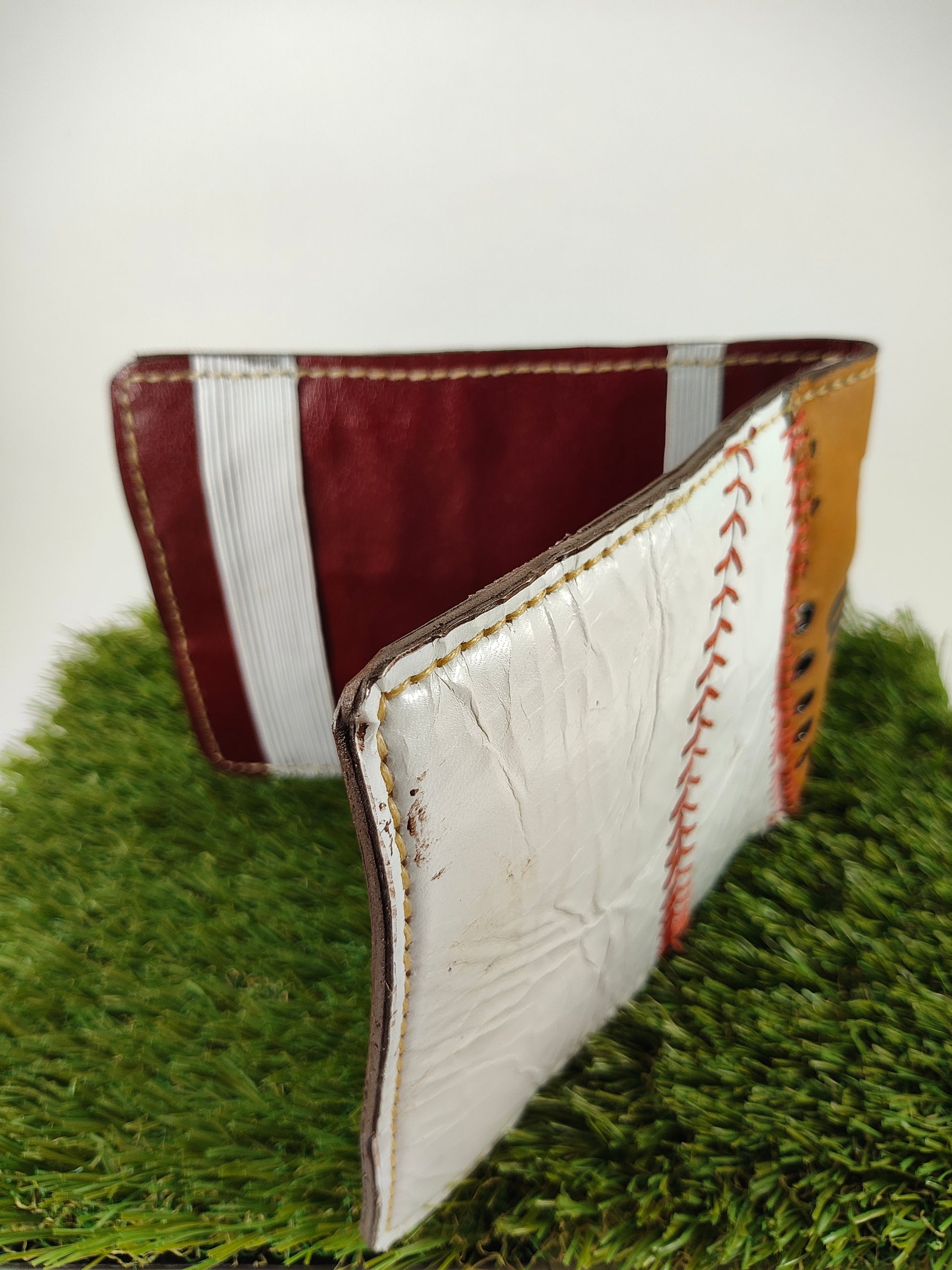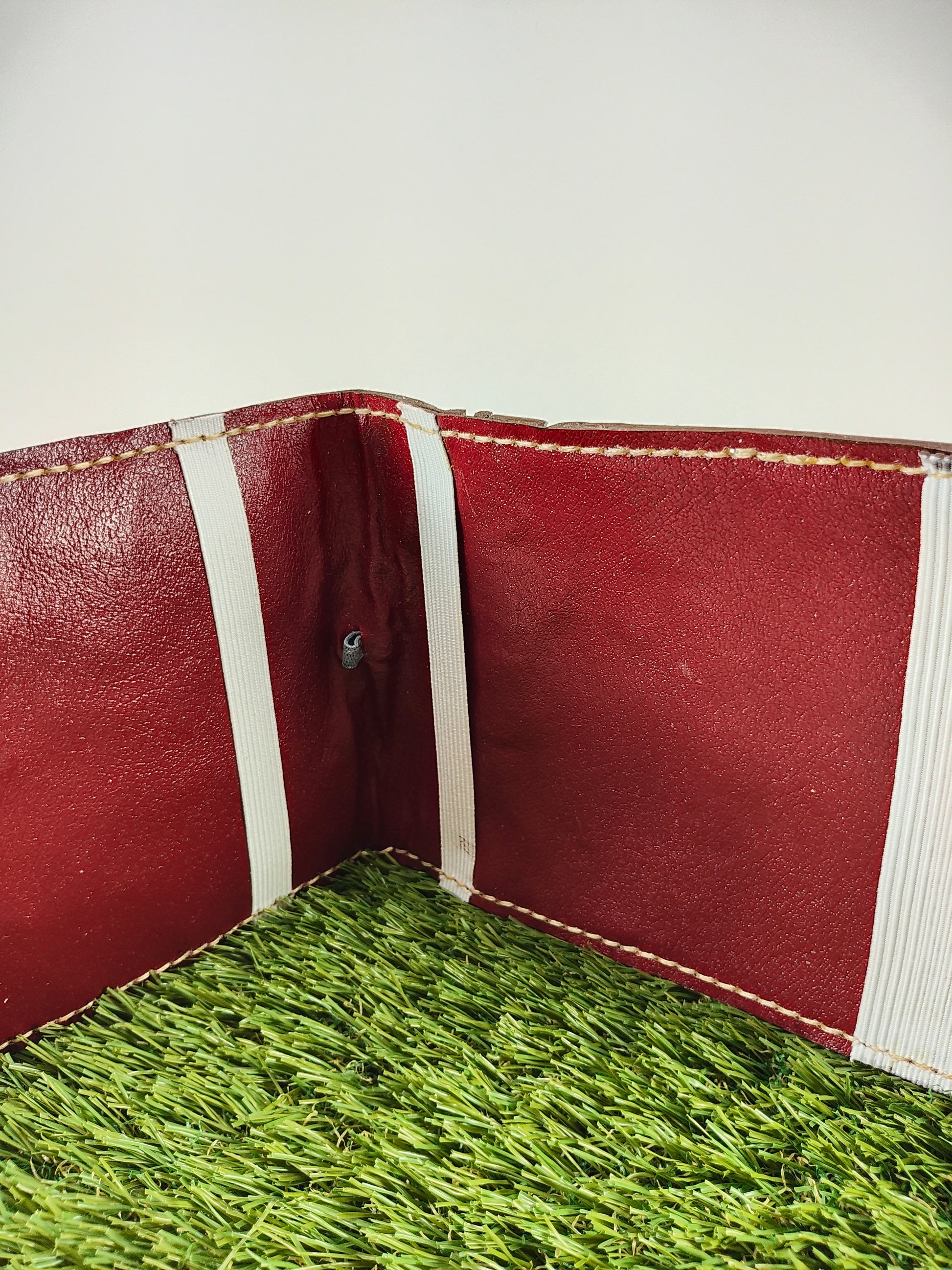 This golf scorecard holder demonstrates how we have to get inventive when we don't have enough baseball glove leather! Sometimes we take from other gloves but for this item we decided to salvage bits of a banner from a little league season and stitch the "cleaner" portions together to give it a very unique look. Measure about 7inches x 5 inches