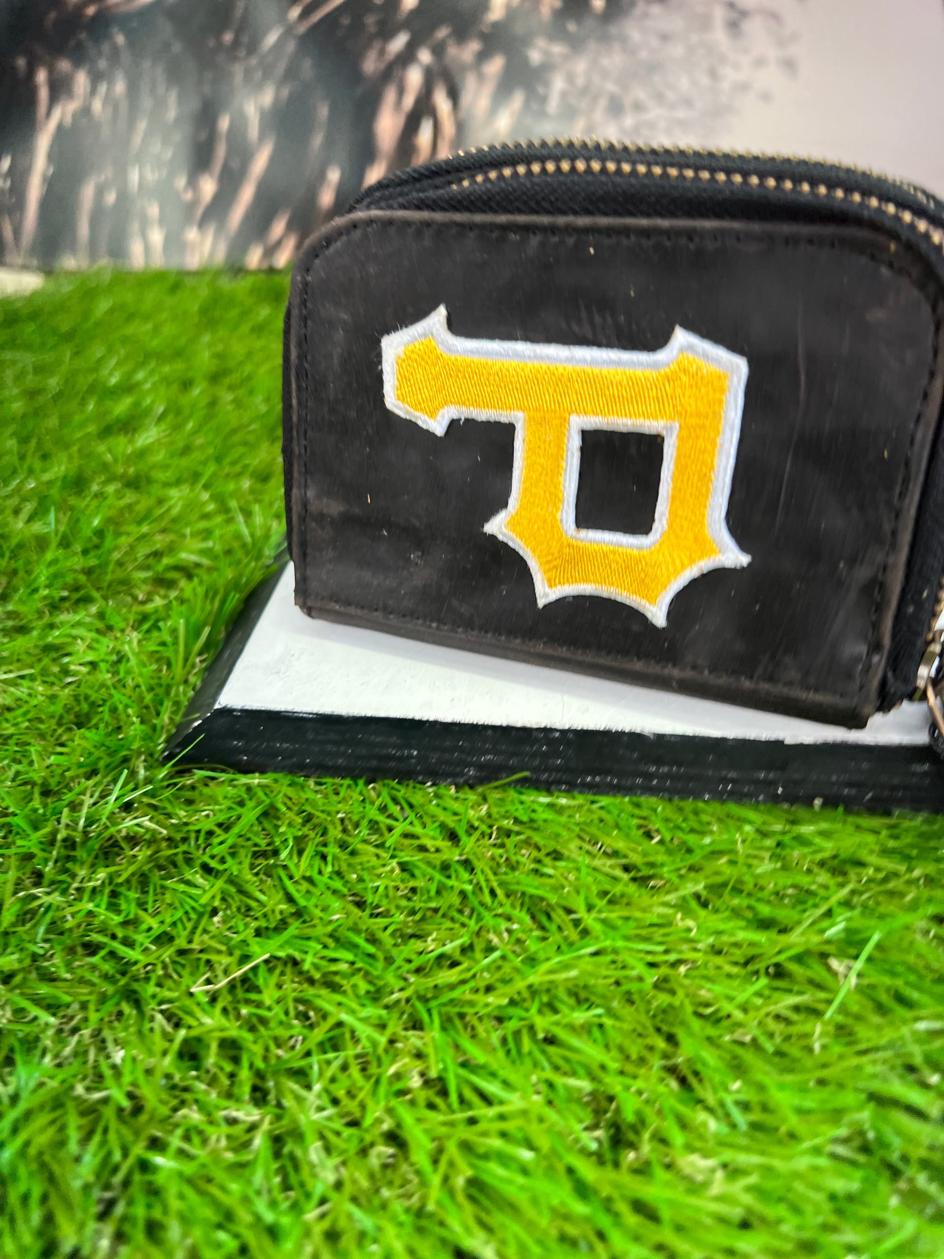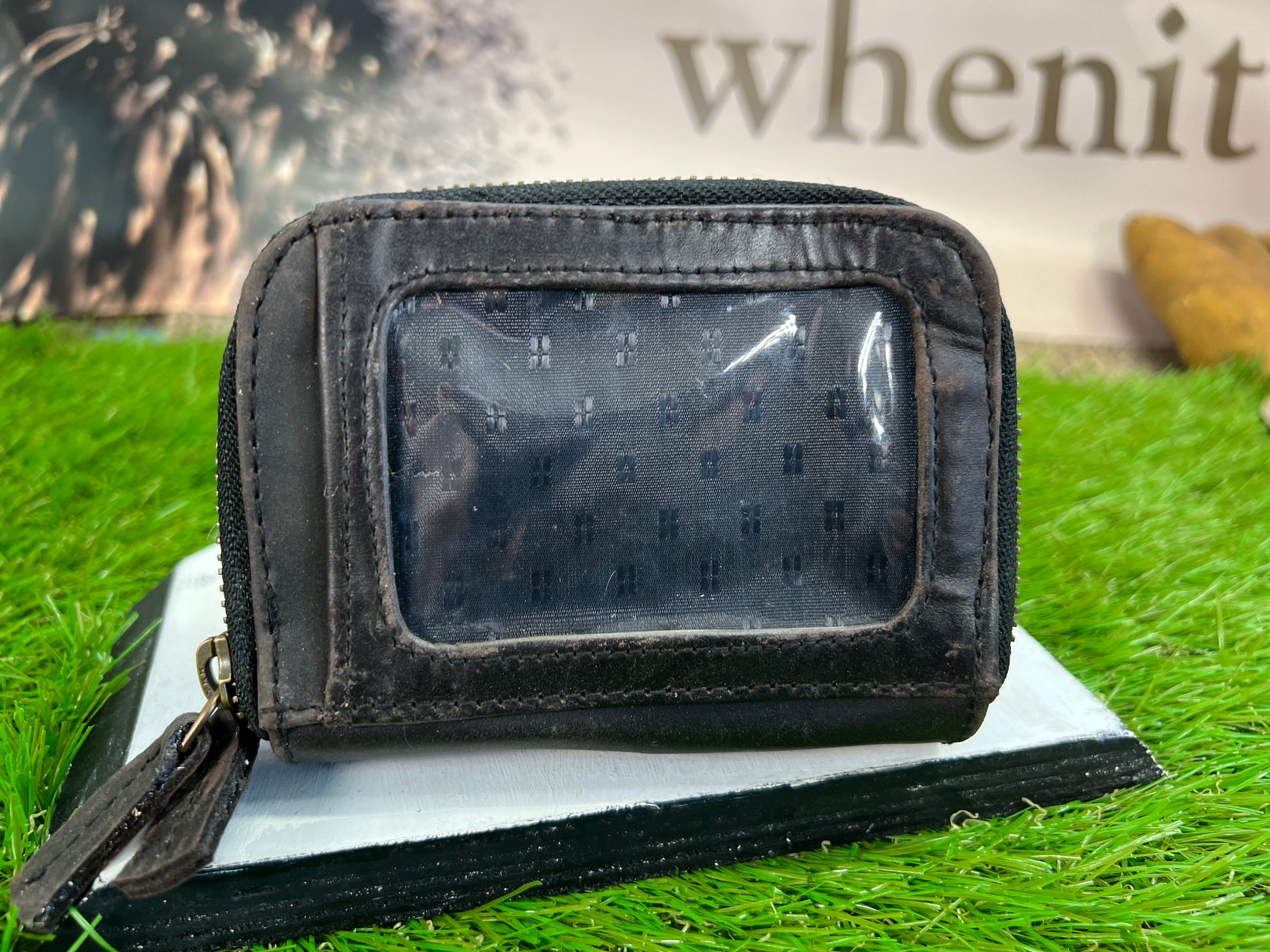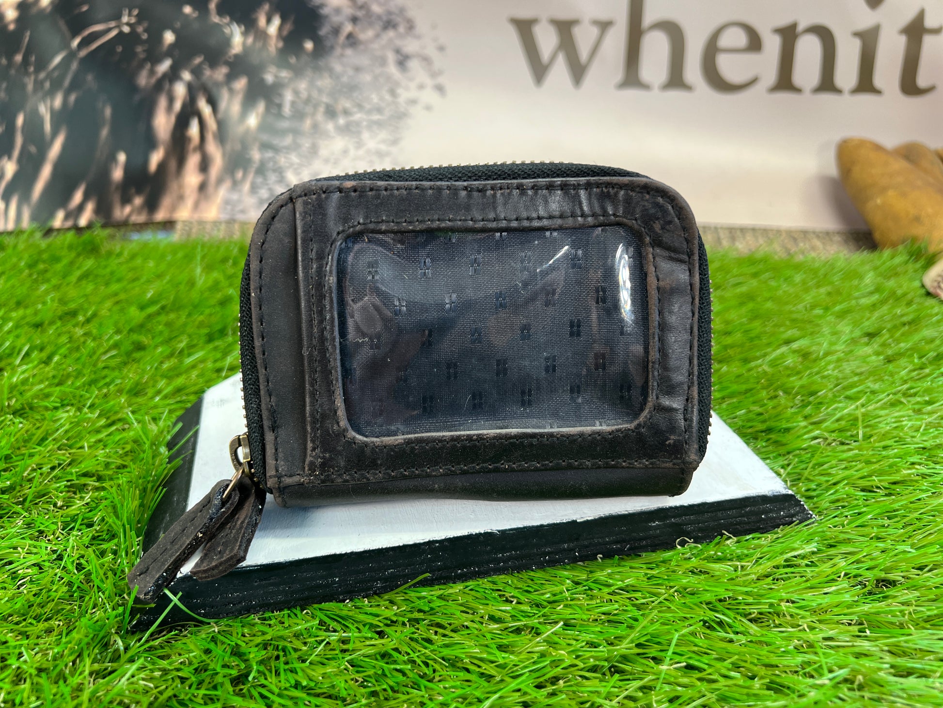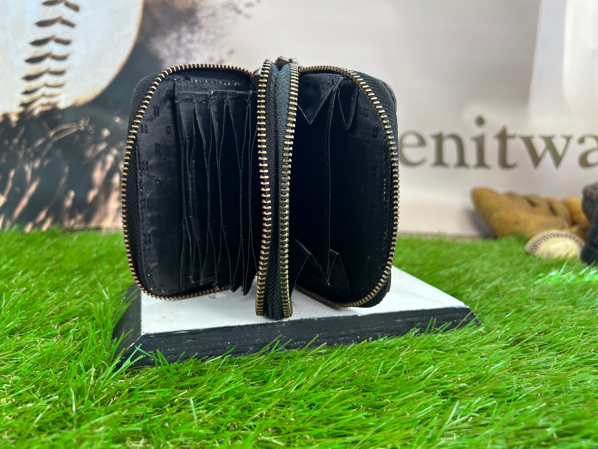 One of our newest products. We call this the Keychain Wallet. This wallet is a personal sized, double zippered, loaded with card pockets and cash room. One side is a clear ID holder, and the other side is ready for your favorite team logo, or special lasered design or name. We can add the keychain of your choice or a leather wrist strap. Available in three shades, tan, medium brown, and dark brown all are real leather. Take a close look at the pictures and the convenience of have two zippered compartments for security. This little beauty measures 5" by 3.75" by 1" when empty.