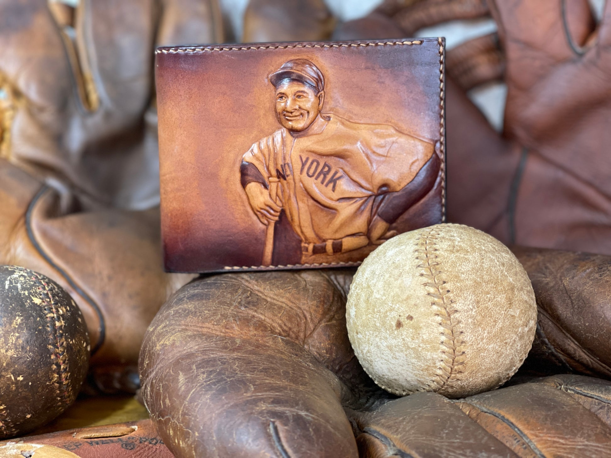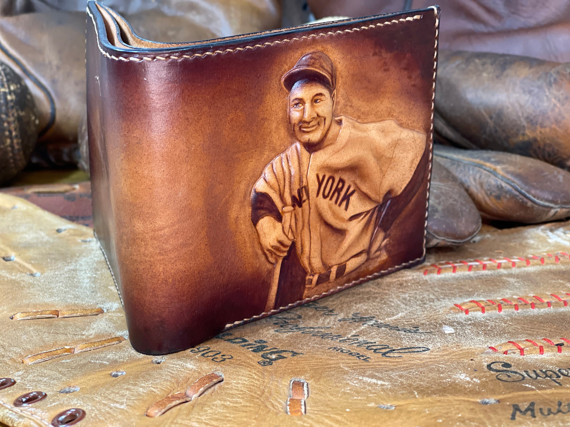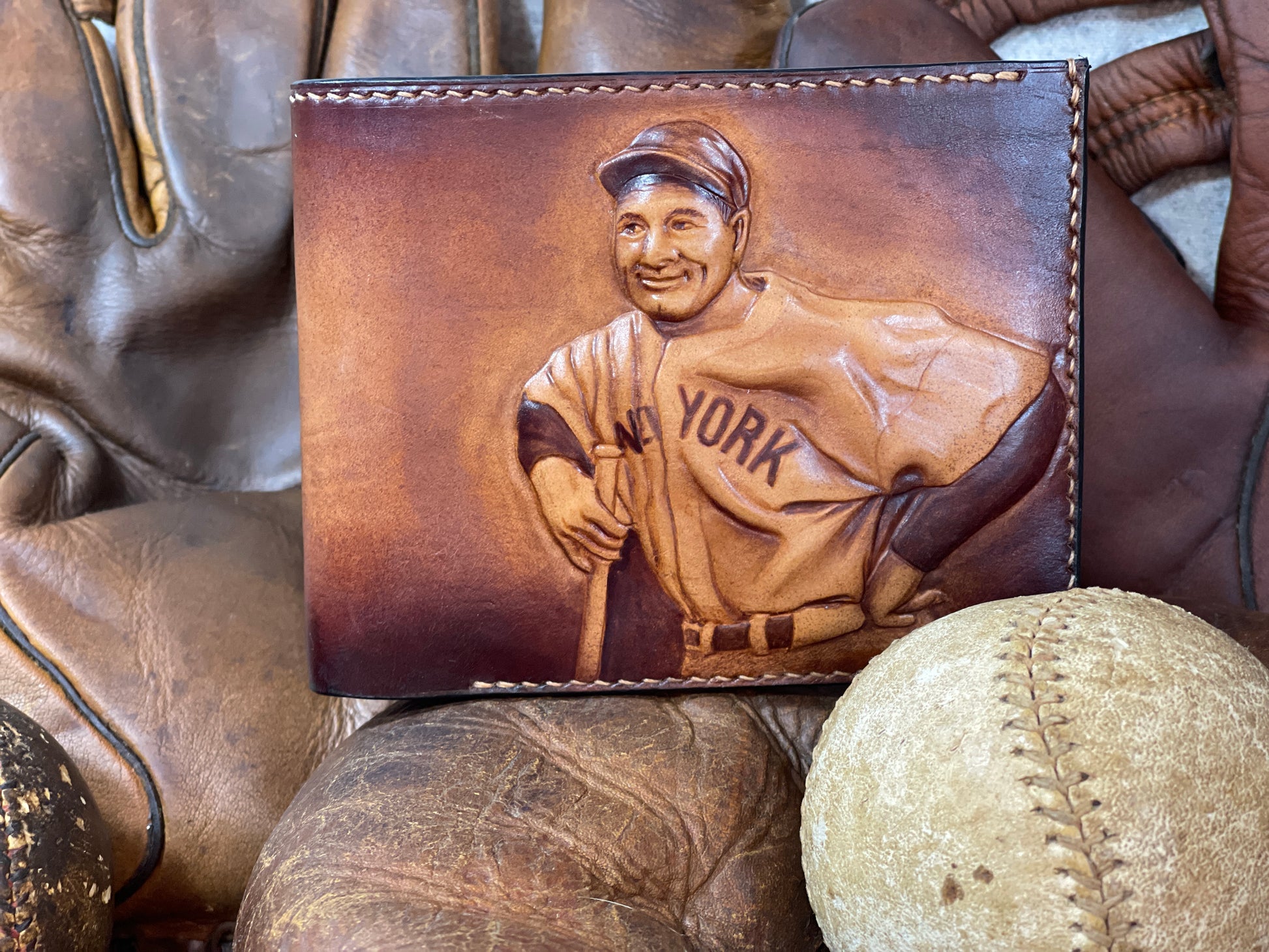 When you talk and think about finding something unique and one of a kind, this should be what you have in mind. We have an artist on hand who has free hand carved the likeness of Lou Gehrig onto this leather wallet.