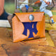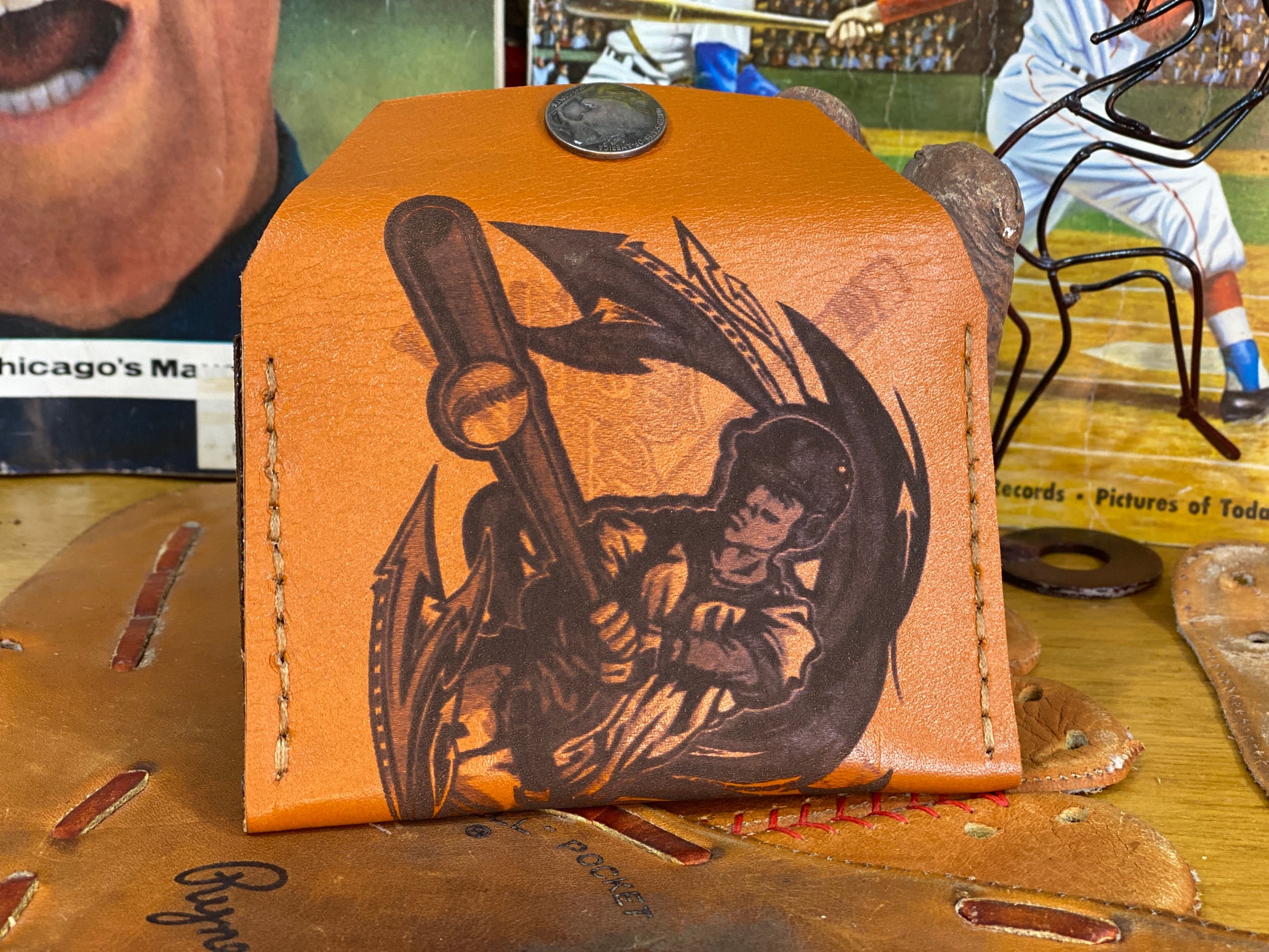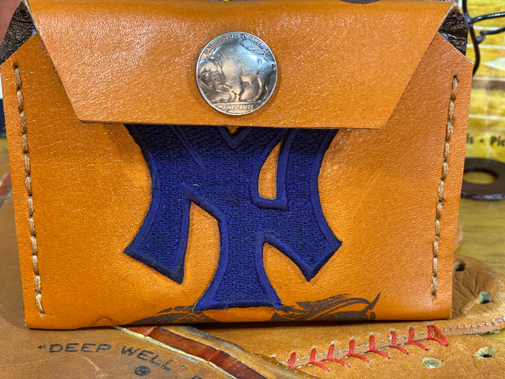 This is a little bit more of a modern take on a snap wallet with a Buffalo nickel snap and the famous New York Yankees logo hand stitched to the front of the wallet. The back features lasered baseball art that would definitely appeal to the younger crowd. Closed measurements of this snap wallet are 3.75" by 5". Take a look at all the pictures and enjoy!