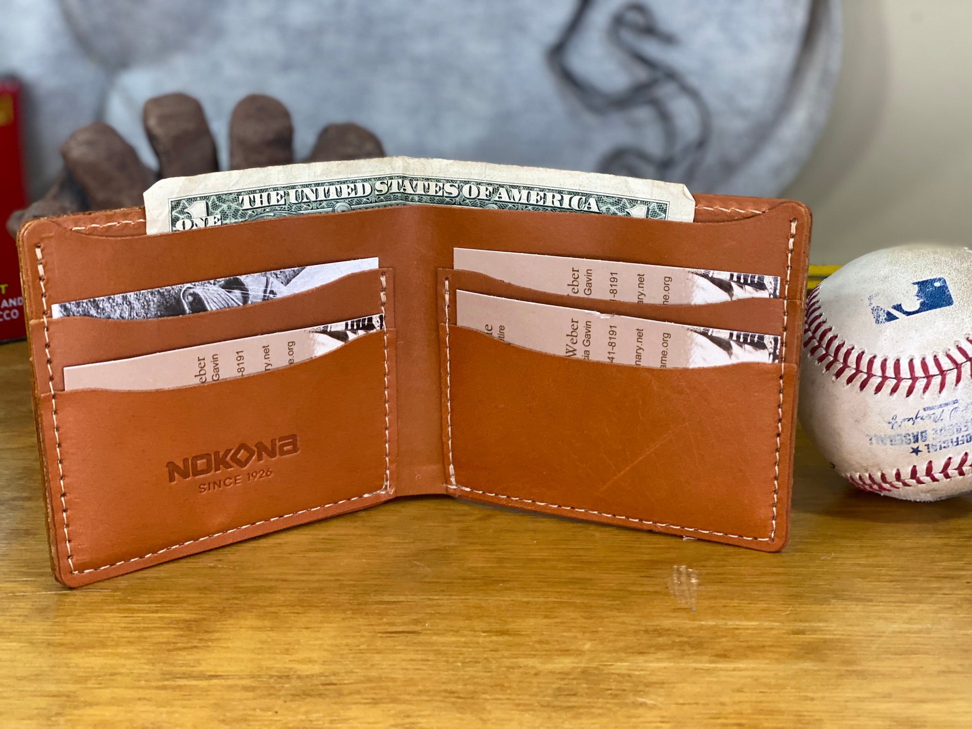 Nokona Traditional Stampede style wallet in natural color manufactured by Nokona for us by the only glove manufacturer in the USA Nokona. Carry America's pastime with you at all times. Our Bifold Wallet is handcrafted with Nokona's proprietary ballglove leather, A premium-grade, full-grain steerhide is sourced from American ranchers and tanned to our specifications, giving it a rich, buttery feel. Every Nokona wallet is individually cut, stitched, and assembled, giving each one its own unique identity and feel.