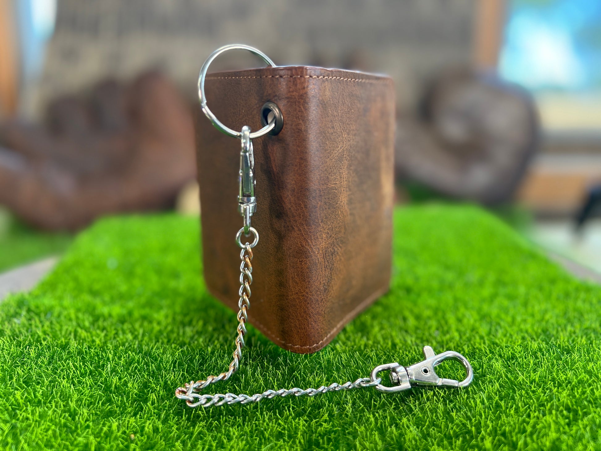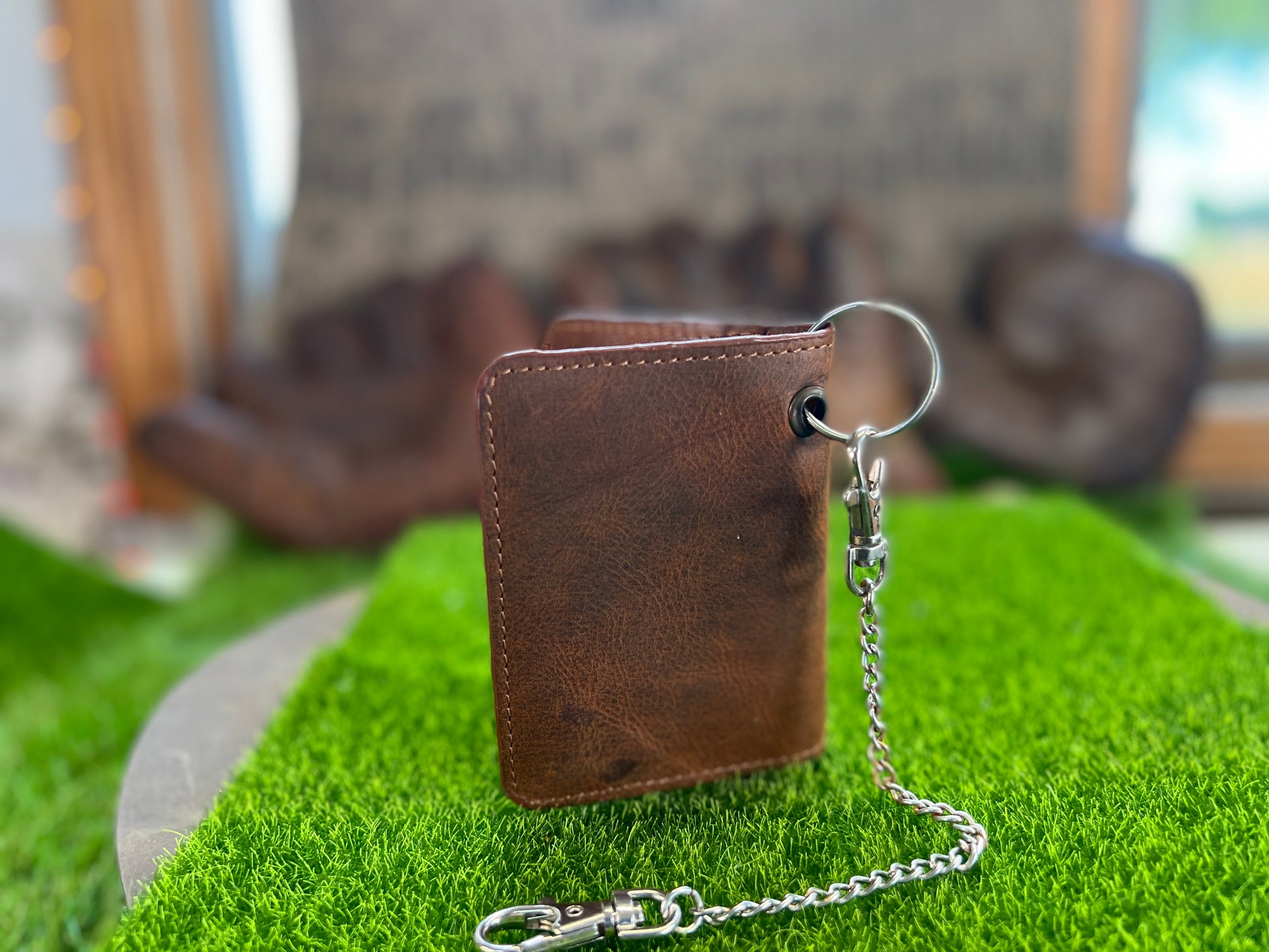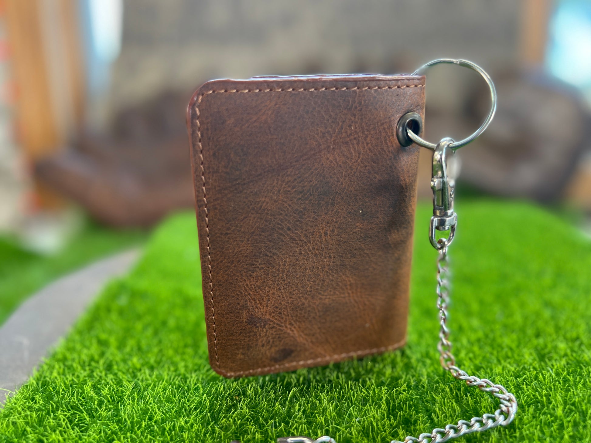 100% All real leather wallet with a chain attached. We can laser this wallet with any signature for no extra charge. This card / cash wallet has three secure card pockets and a pocket for folded cash.