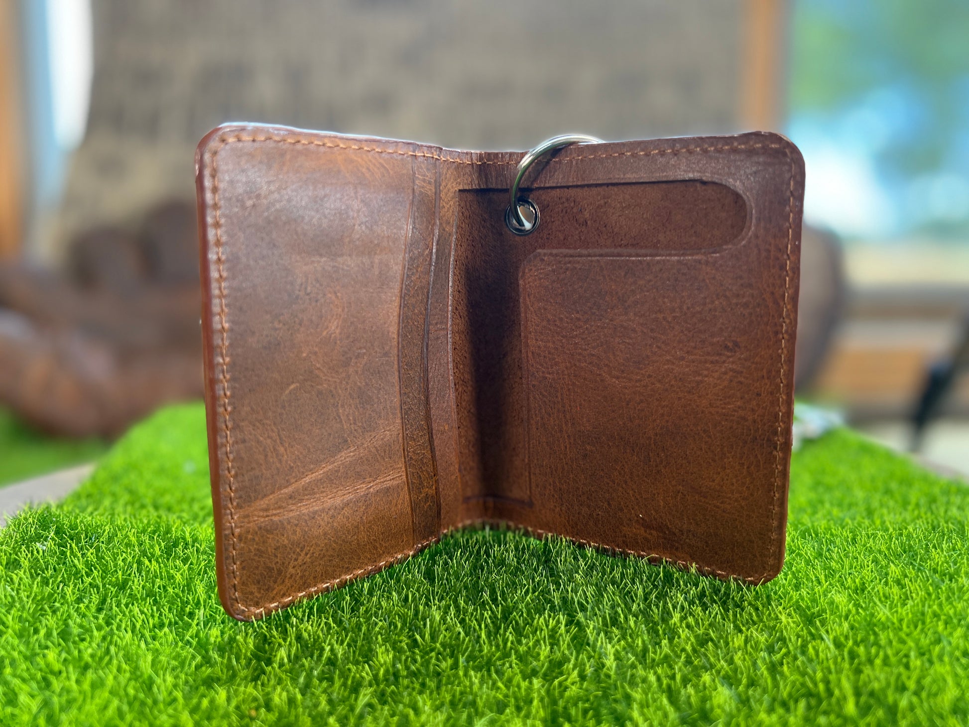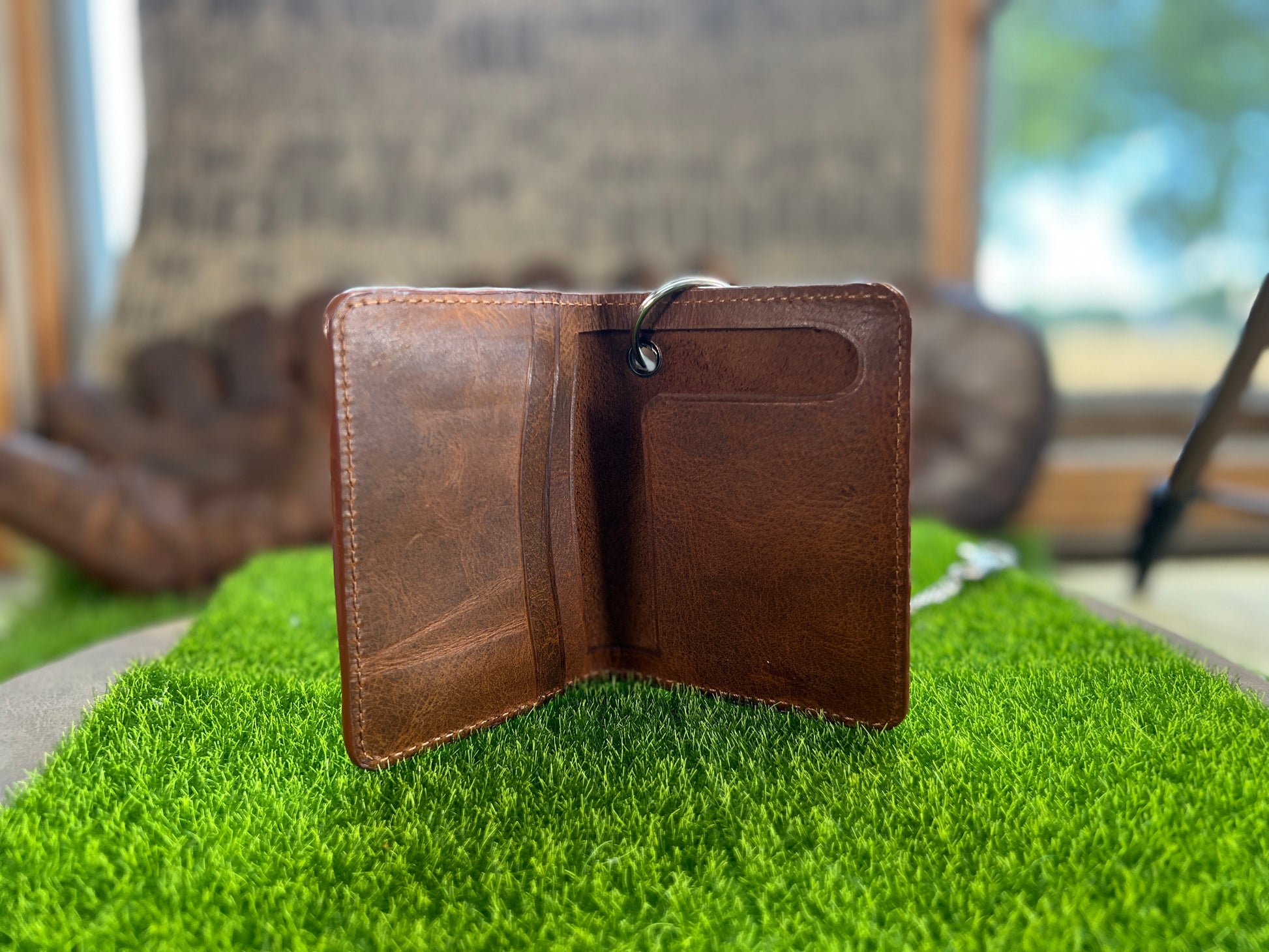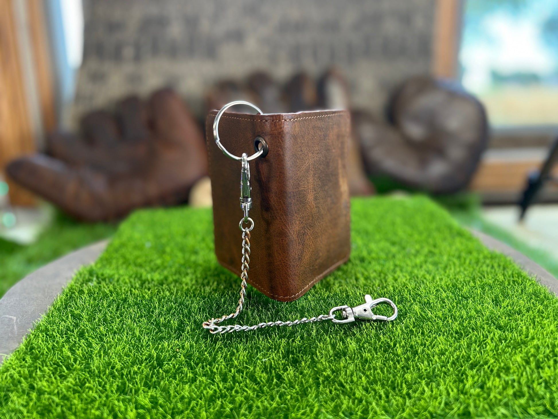 100% All real leather wallet with a chain attached. We can laser this wallet with any signature for no extra charge. This card / cash wallet has three secure card pockets and a pocket for folded cash.