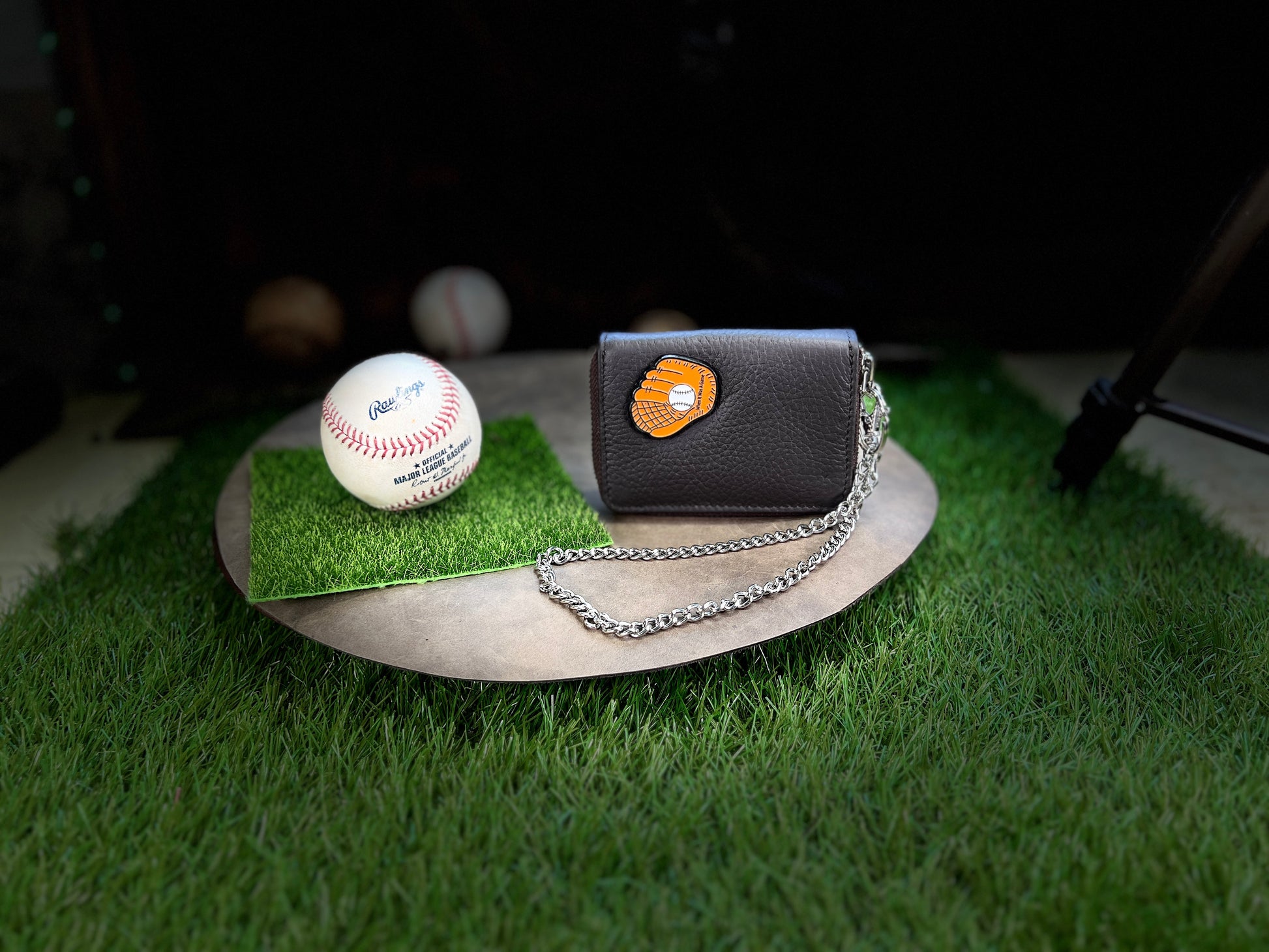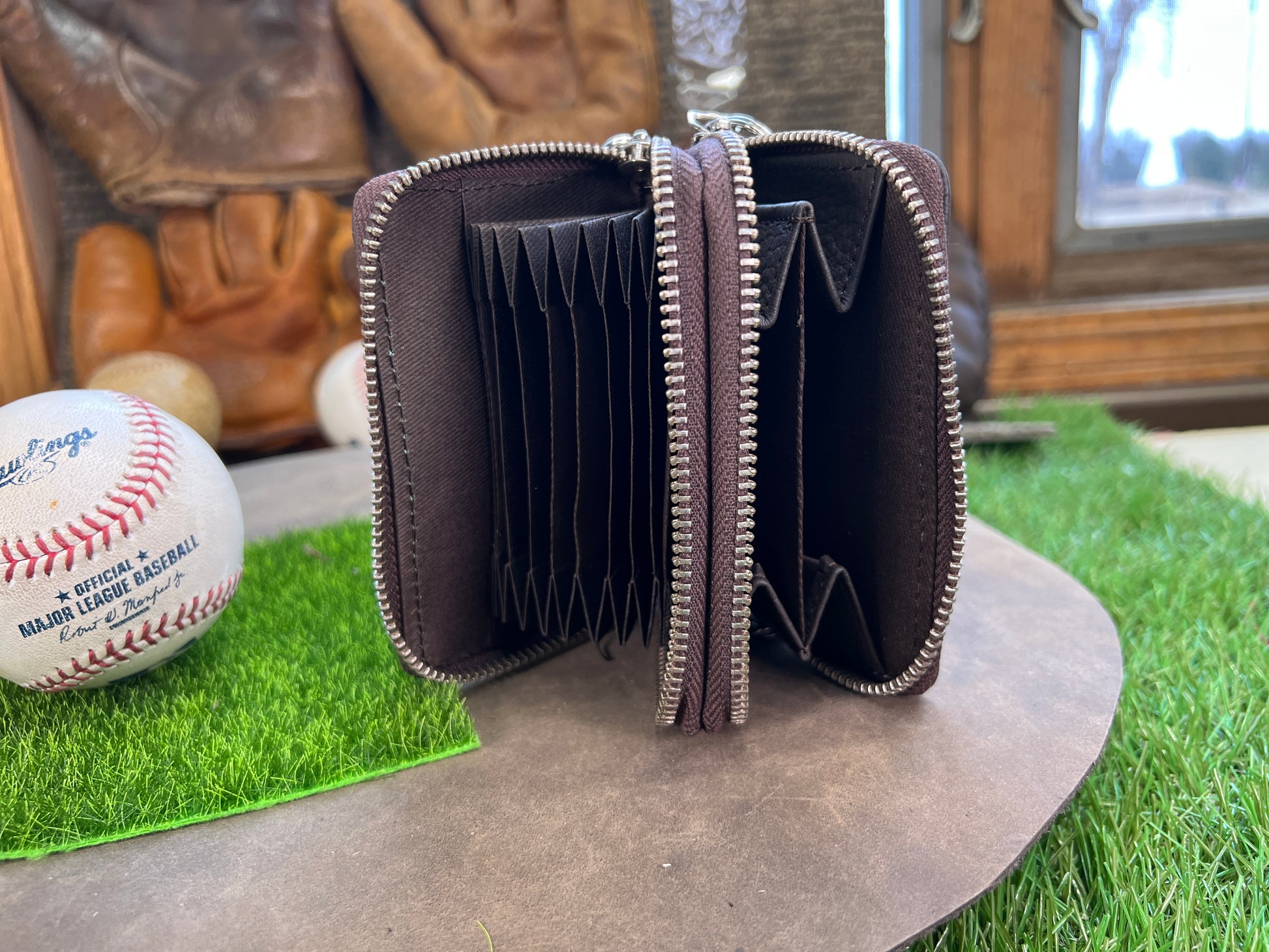 A more compact version of the trucker style, but has card and cash room for days. All leather wallet handmade and comes with the attached metal baseball button. This wallet measures 3.5" by 5" and has two zipper compartments, one with card pockets and the other has larger pockets for folded cash or whatever. The back side has a clear ID holder as well.