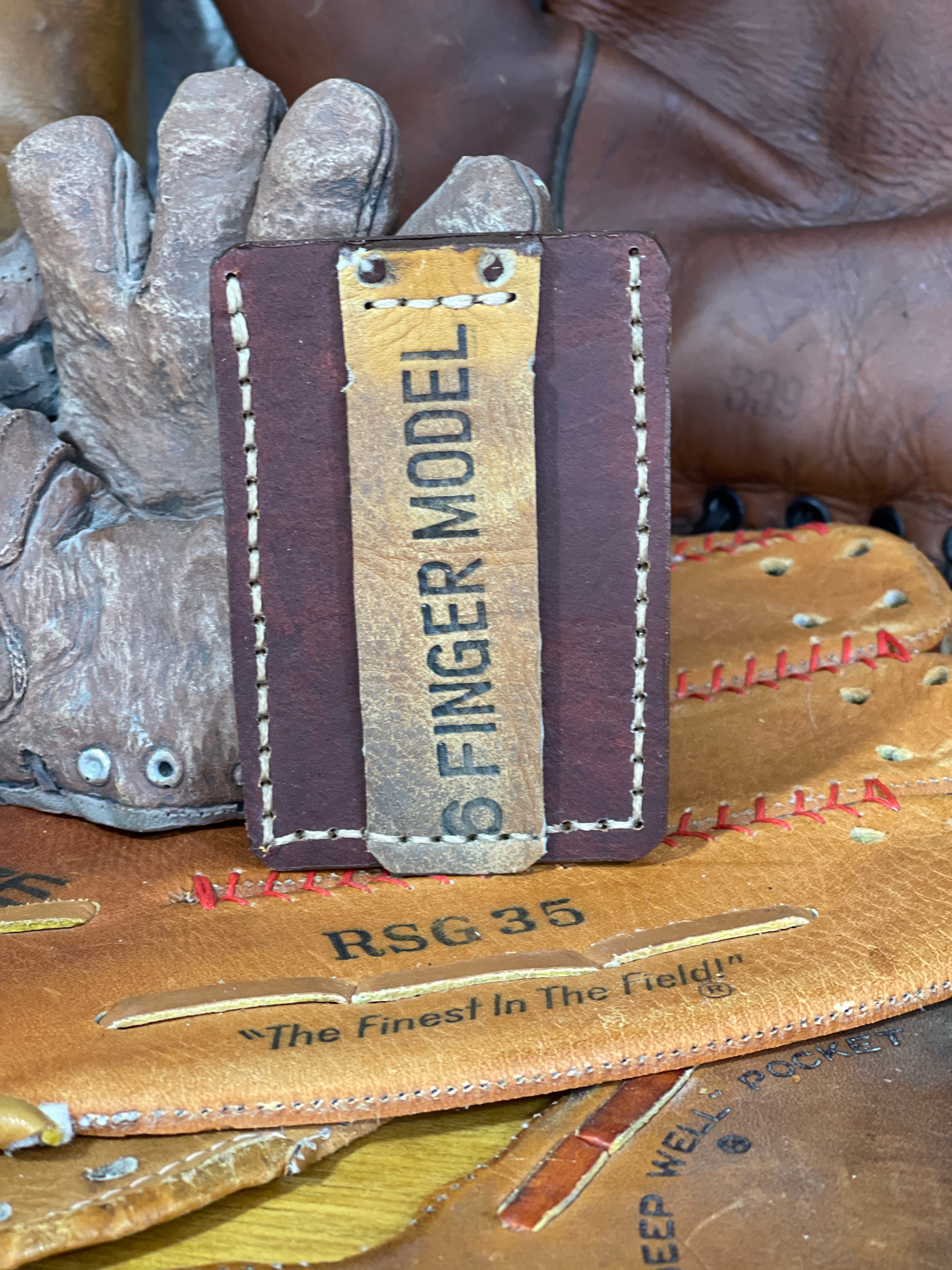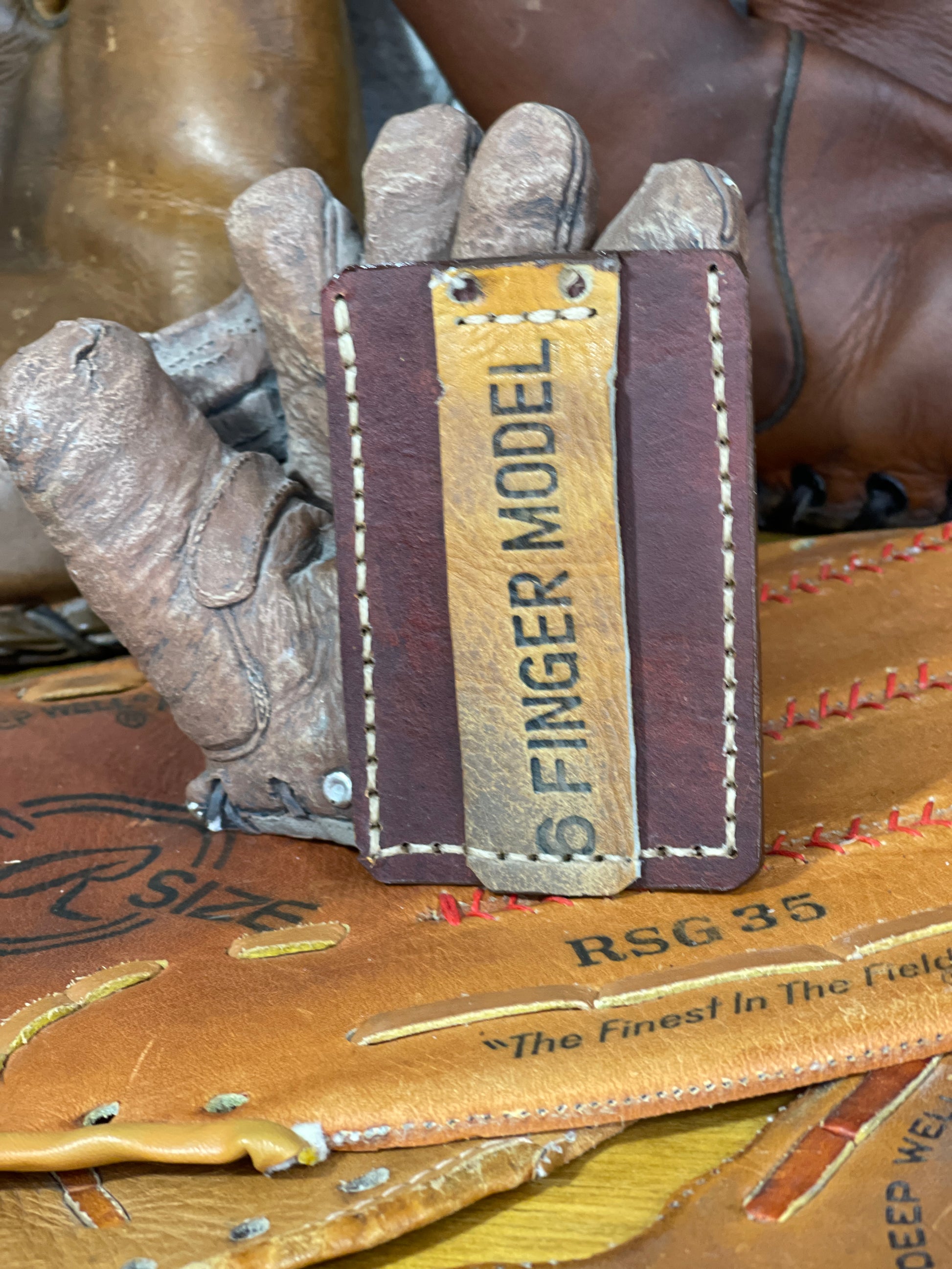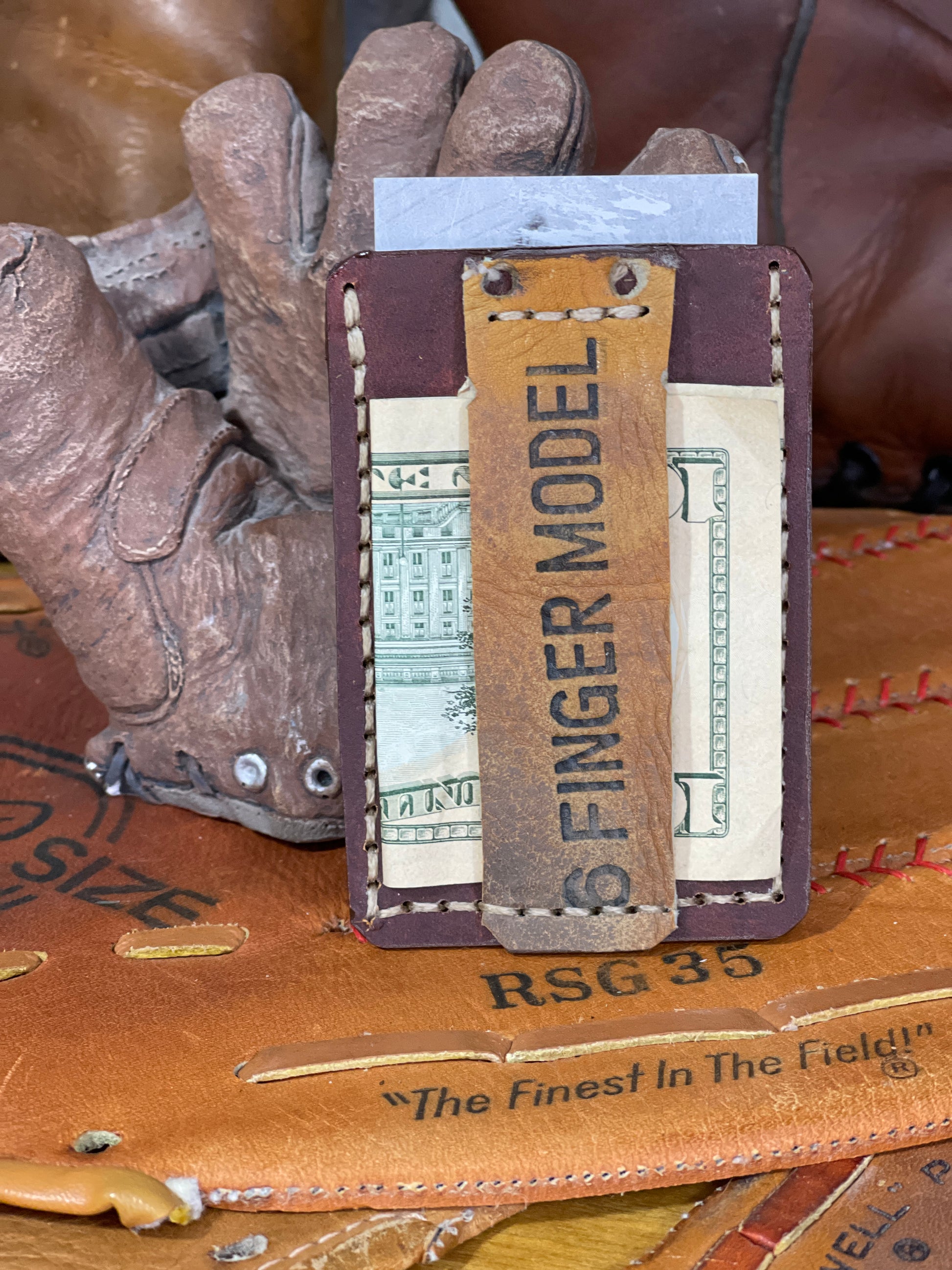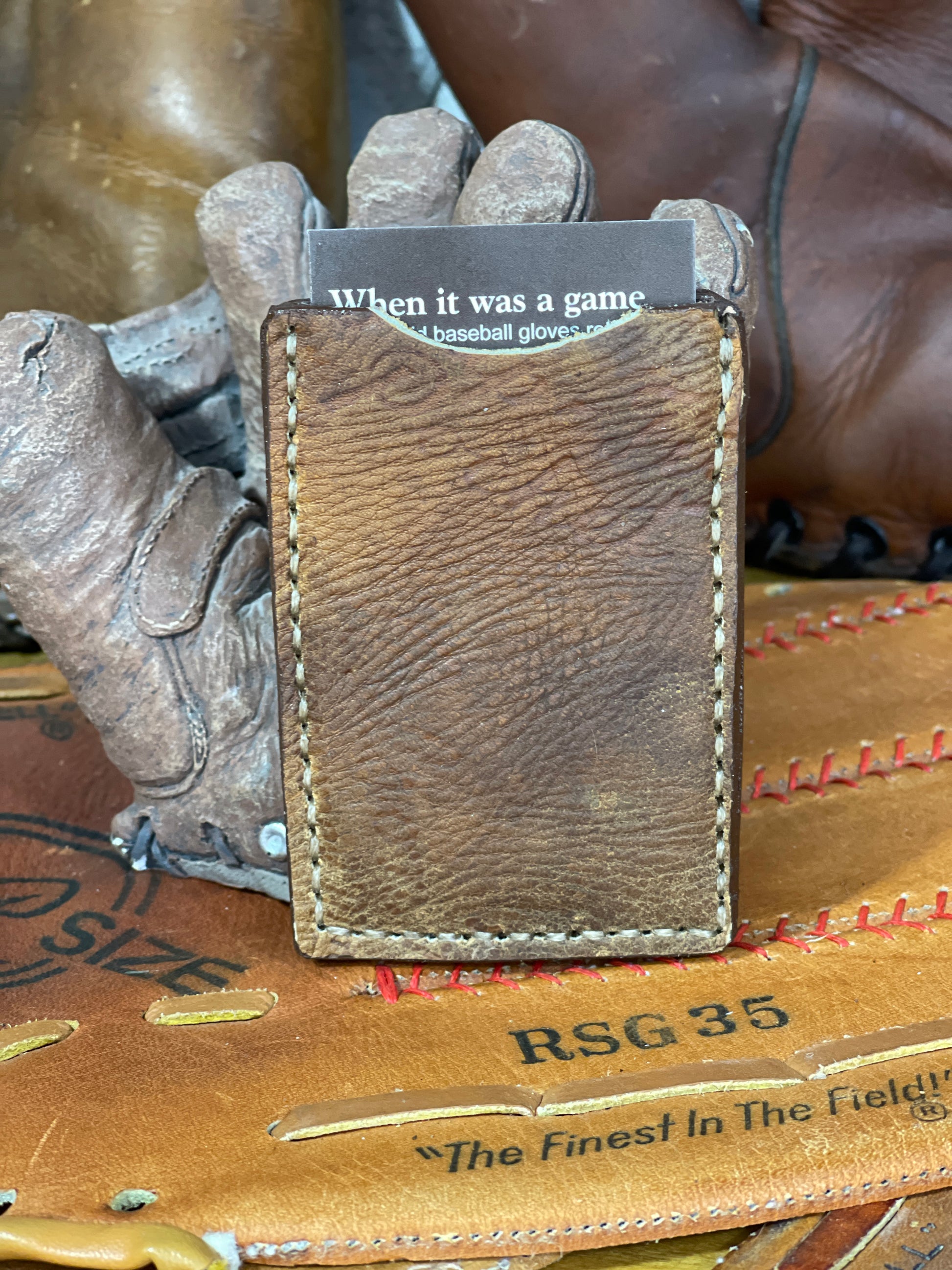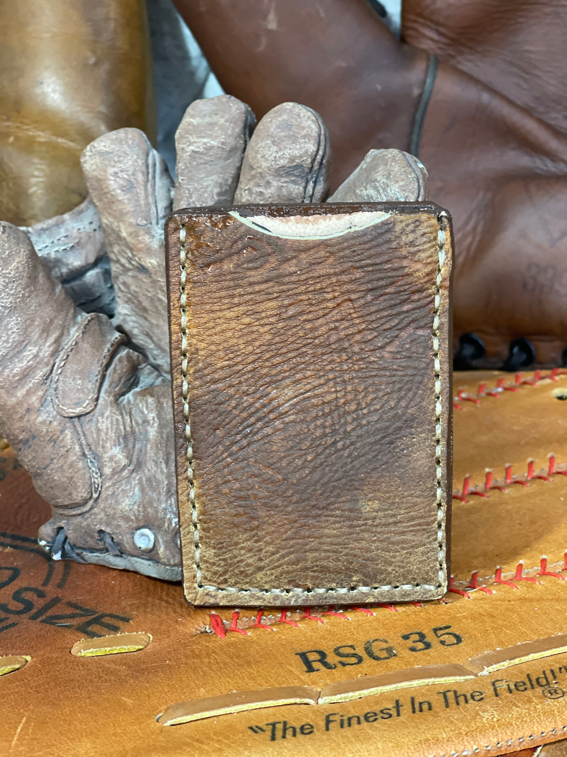 Simple yet functional with equal parts 100% leather and a solid piece of a vintage baseball glove. Room for several cards and the baseball leather money clip for any loose cash bills. Measurements of this wallet are 3.75" by 2.5".