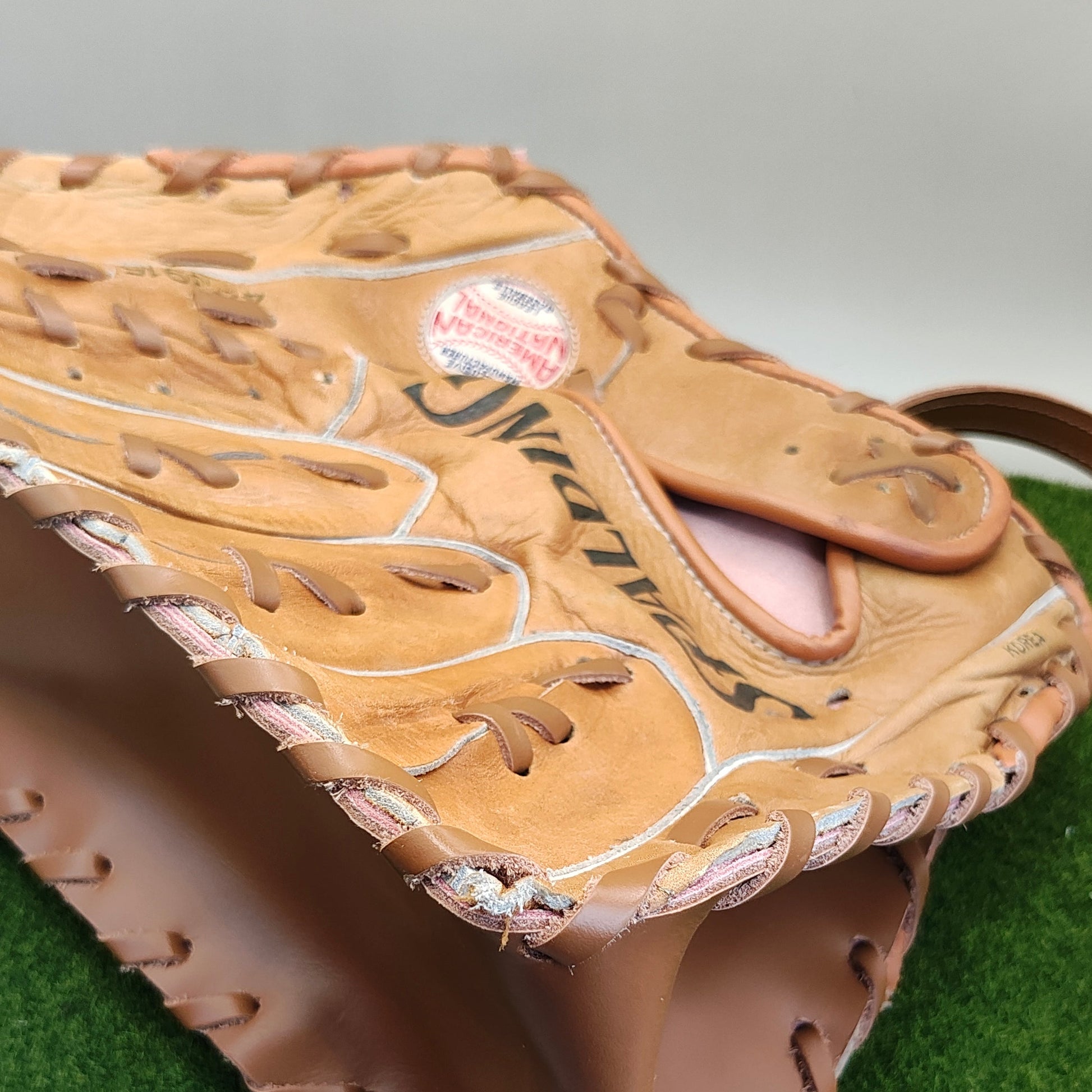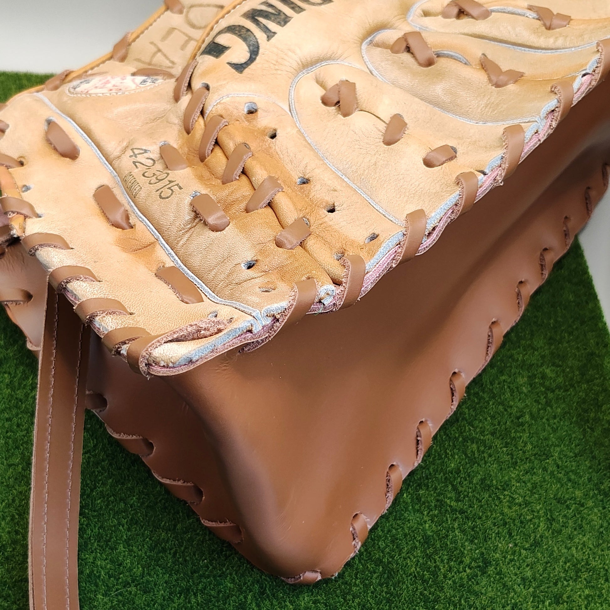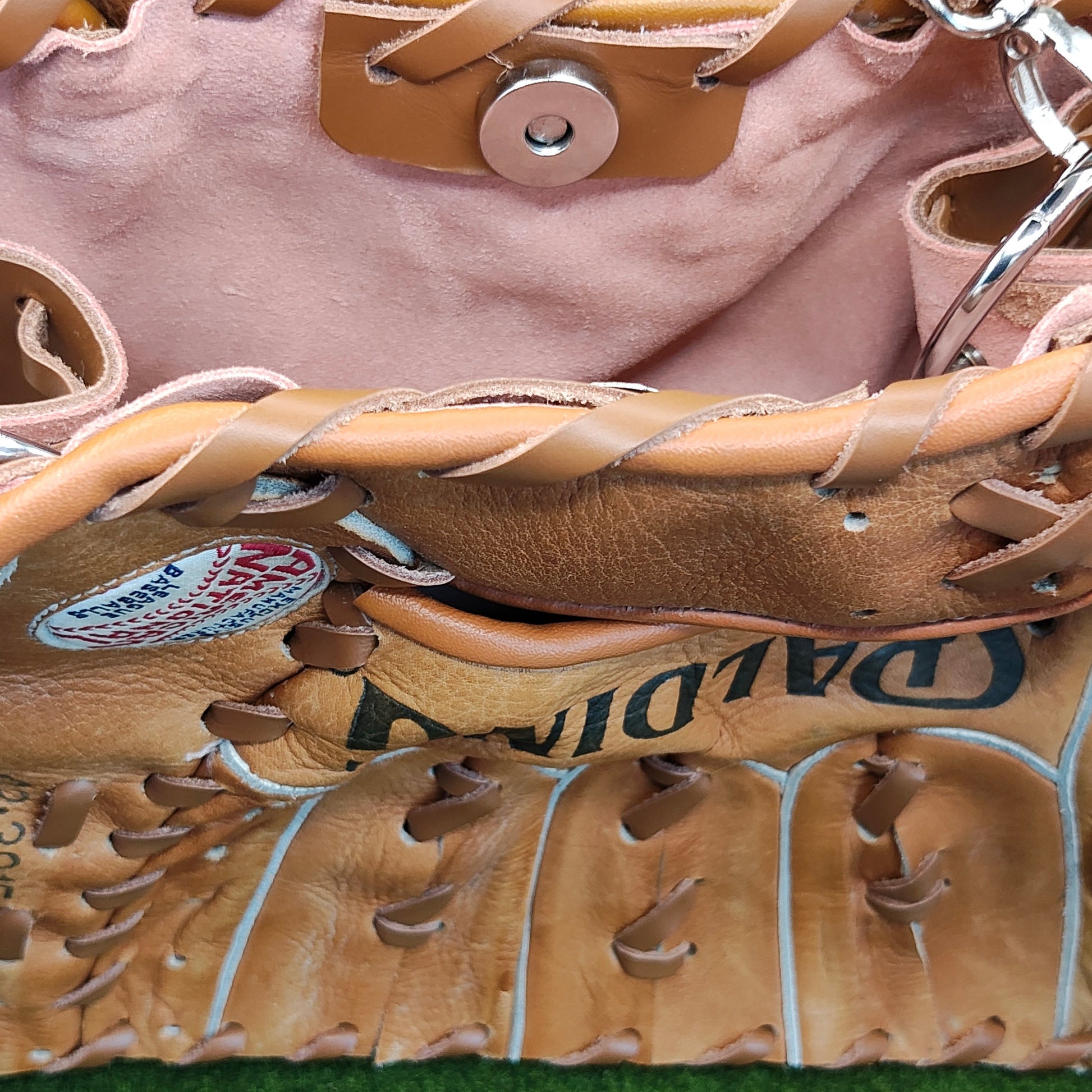 This particular purse was made using two Babe Ruth signature gloves. Looks like someone named Dean owned one of them :) This Innnings purse is different from others in that we used a very fine pink leather liner on the interior and used metal eyelets.