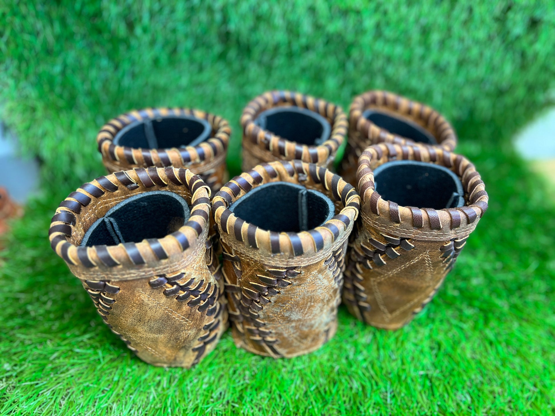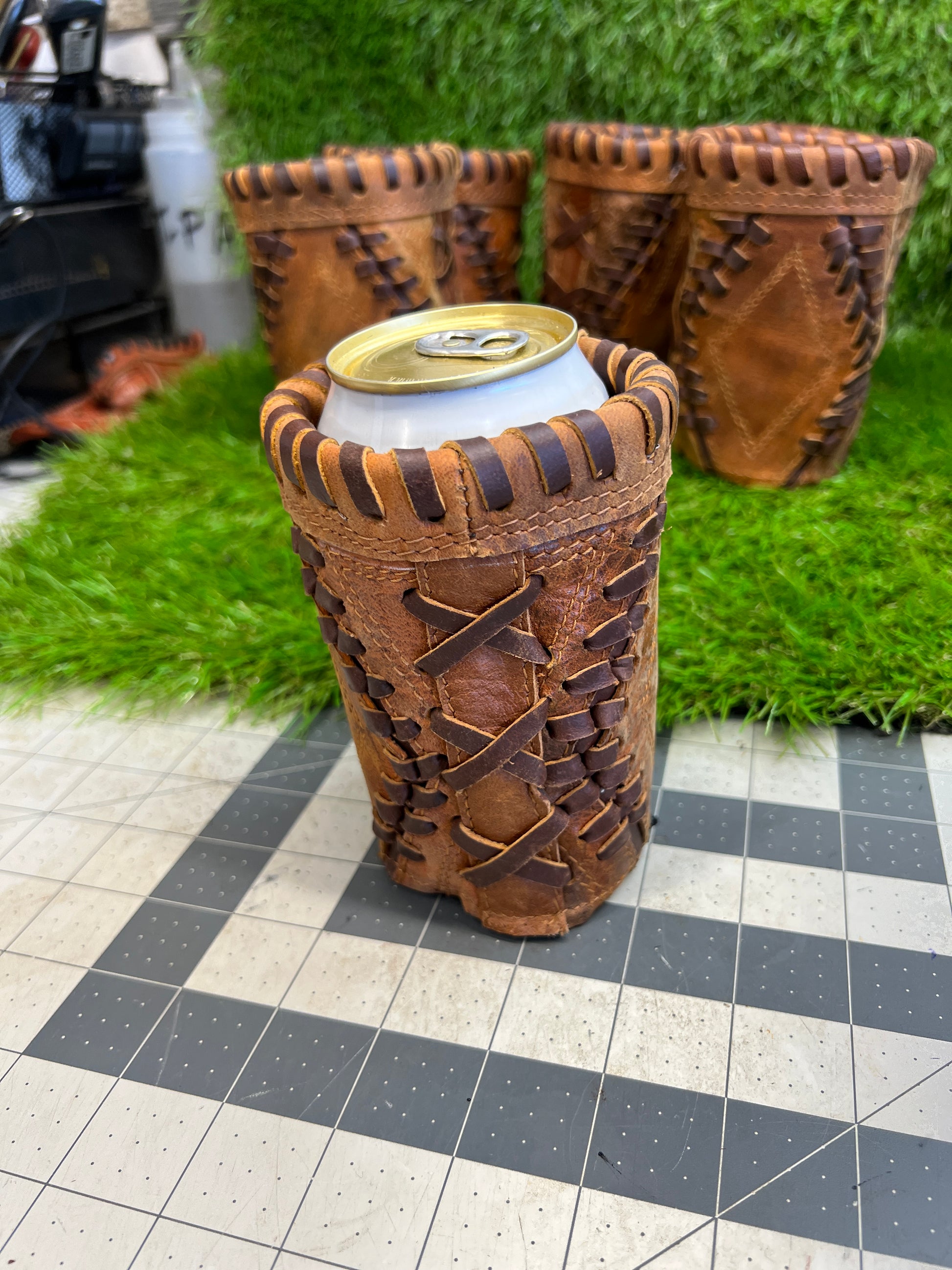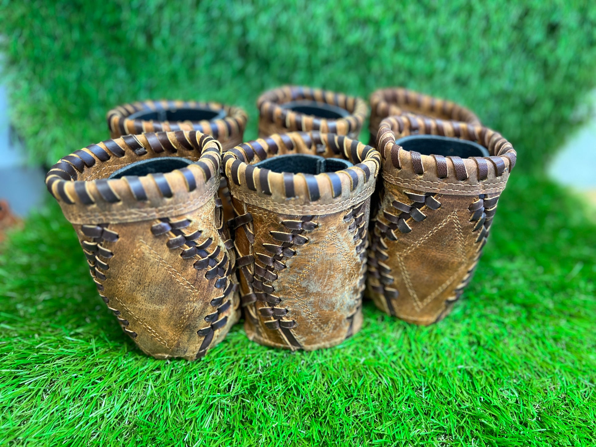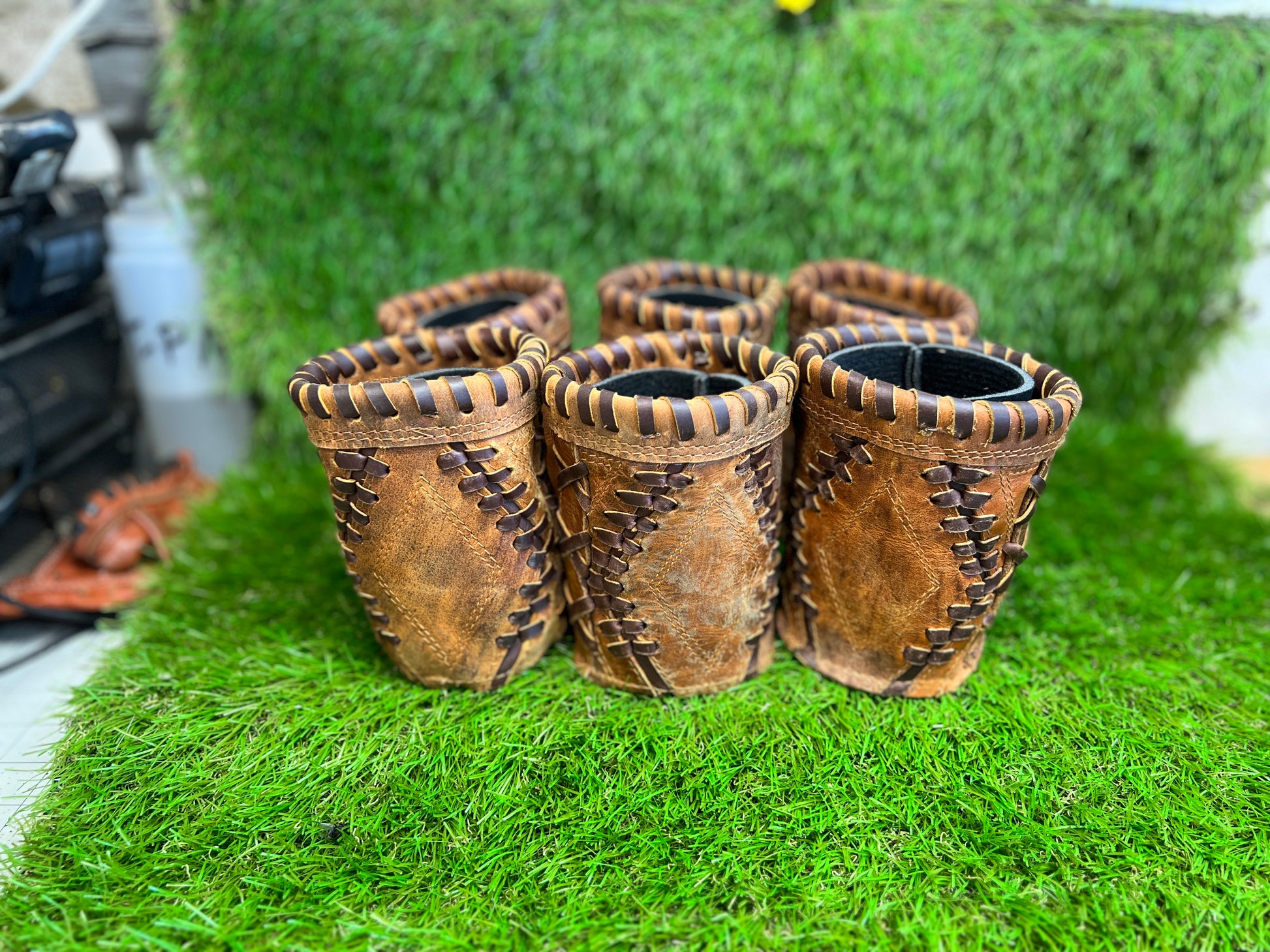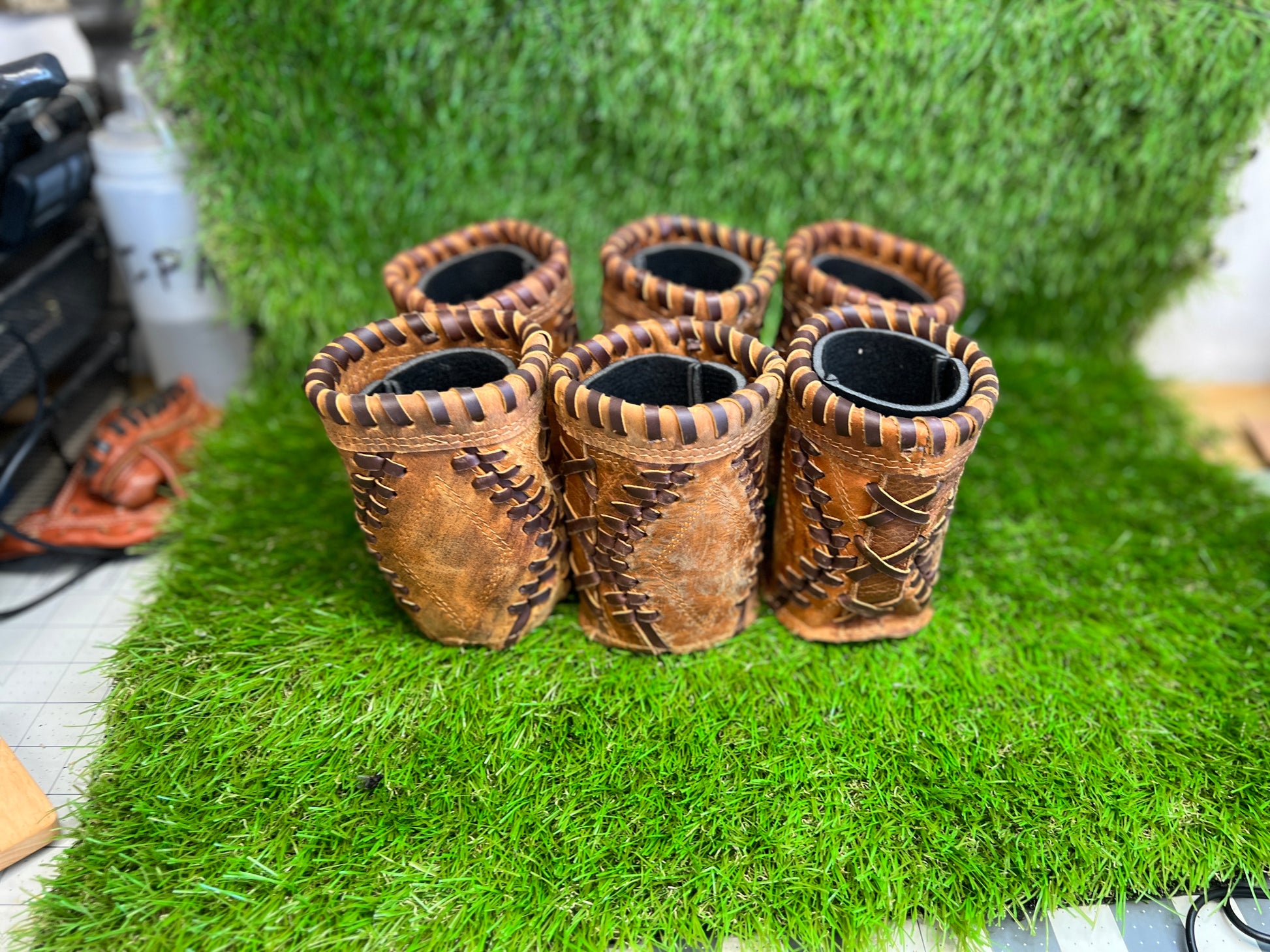 Get a 6 pack of coozies for one low price, One of our Limited Edition style Cozies. These cozies are our latest design cozie that is 100% leather including the bottom. We make the original baseball pocket coozie and have a design Get will last a very long time. We offer the cozies in many different color combinations. We offer coozies plain and in Limited Editions