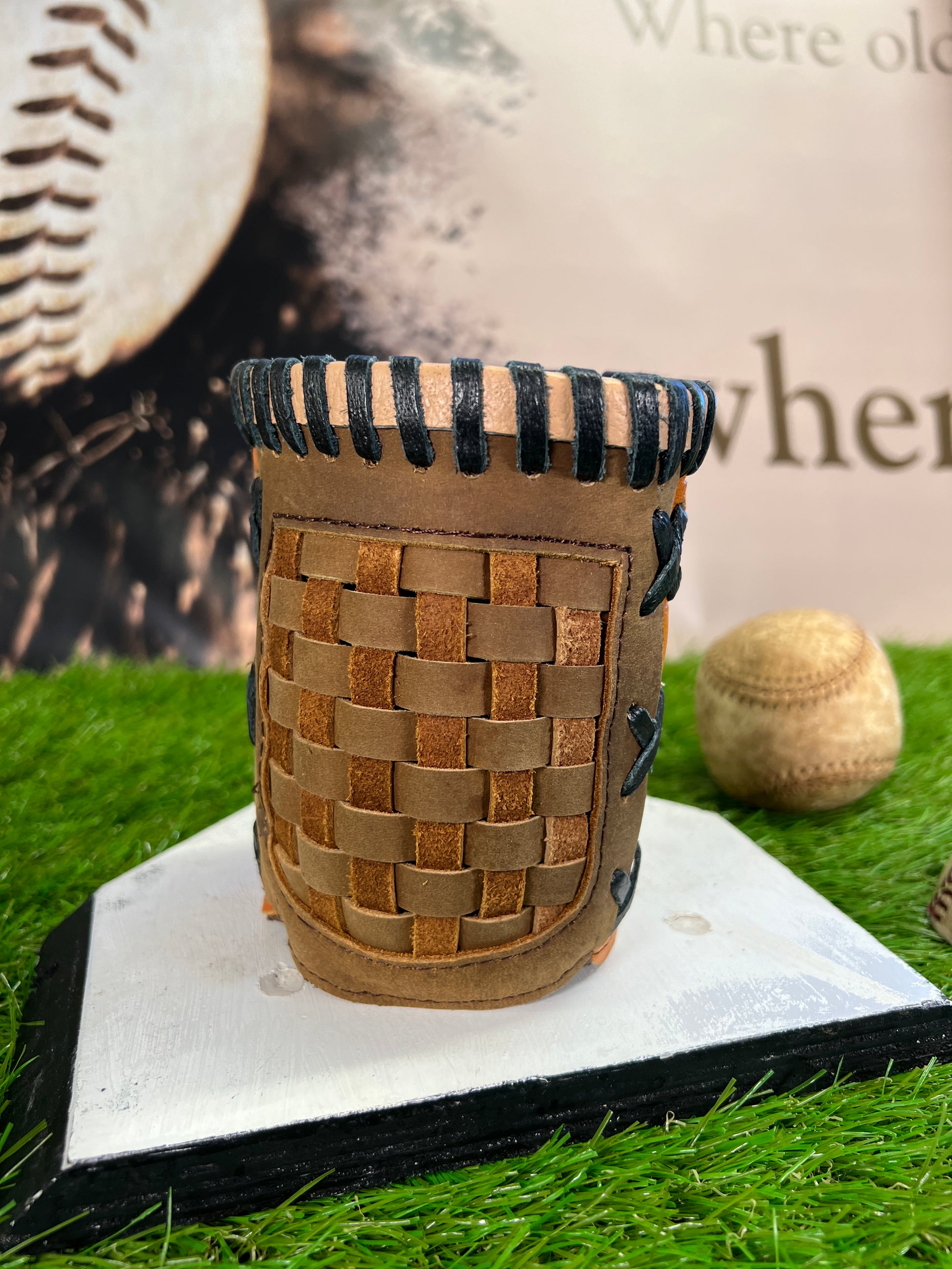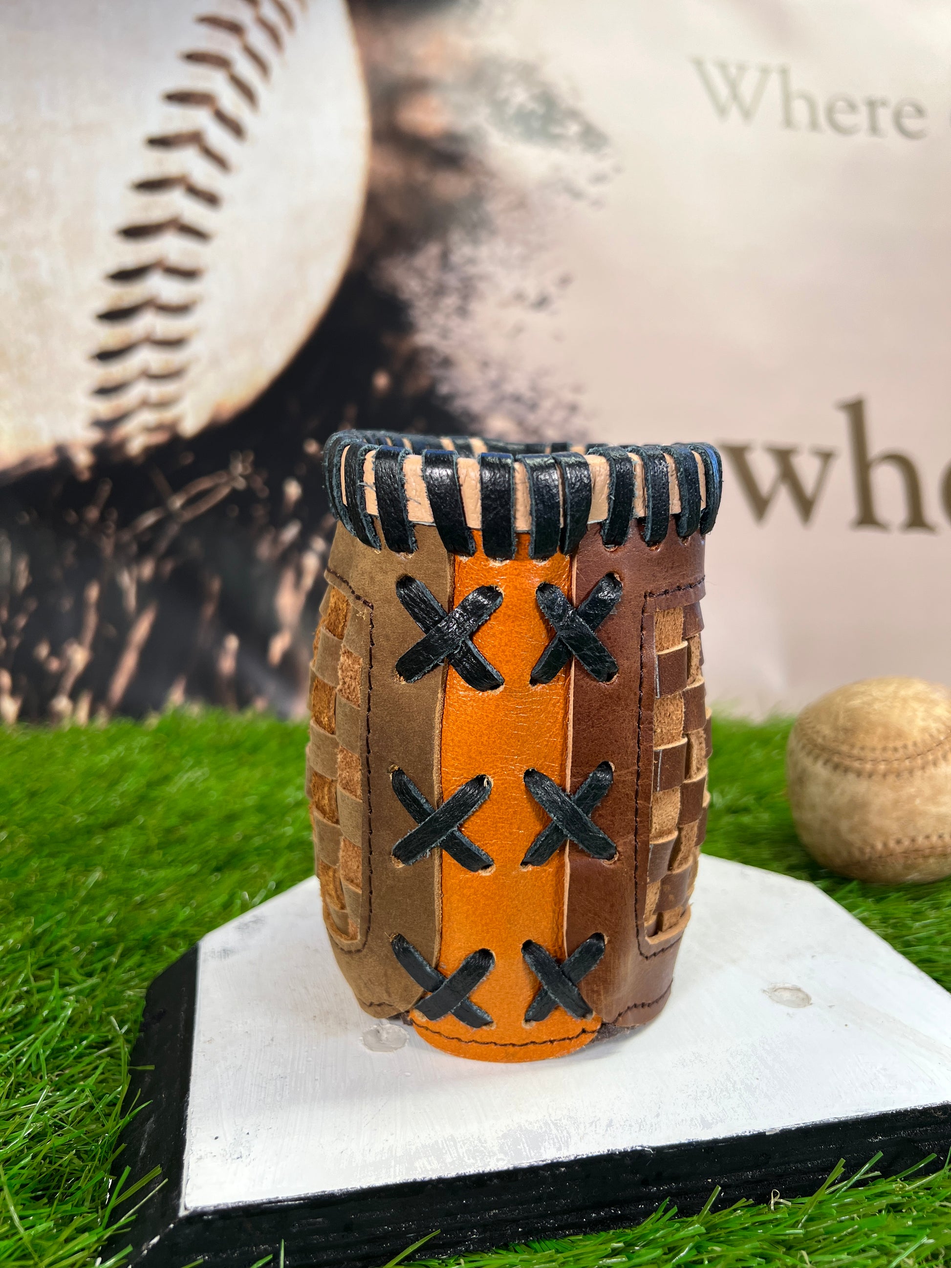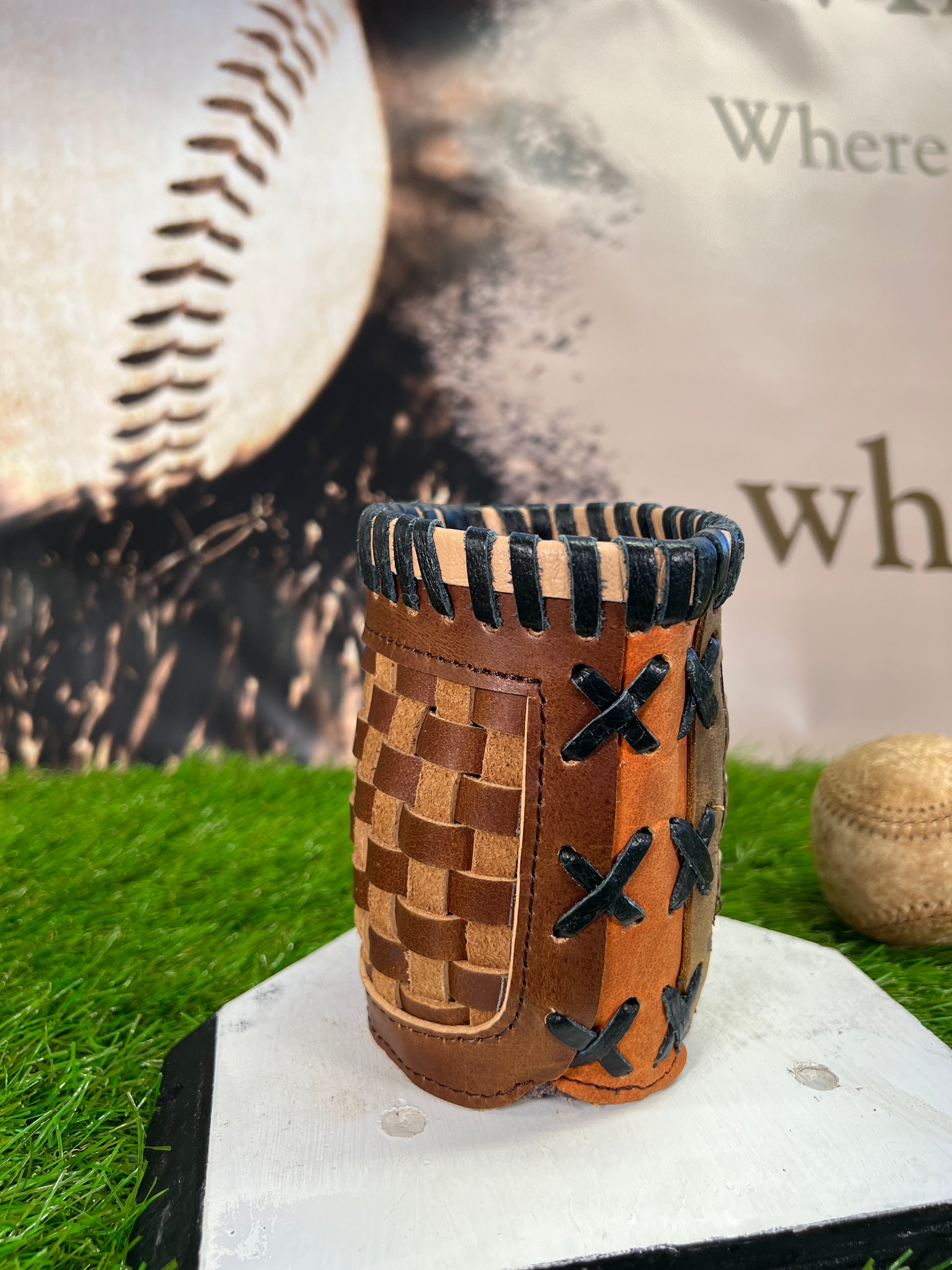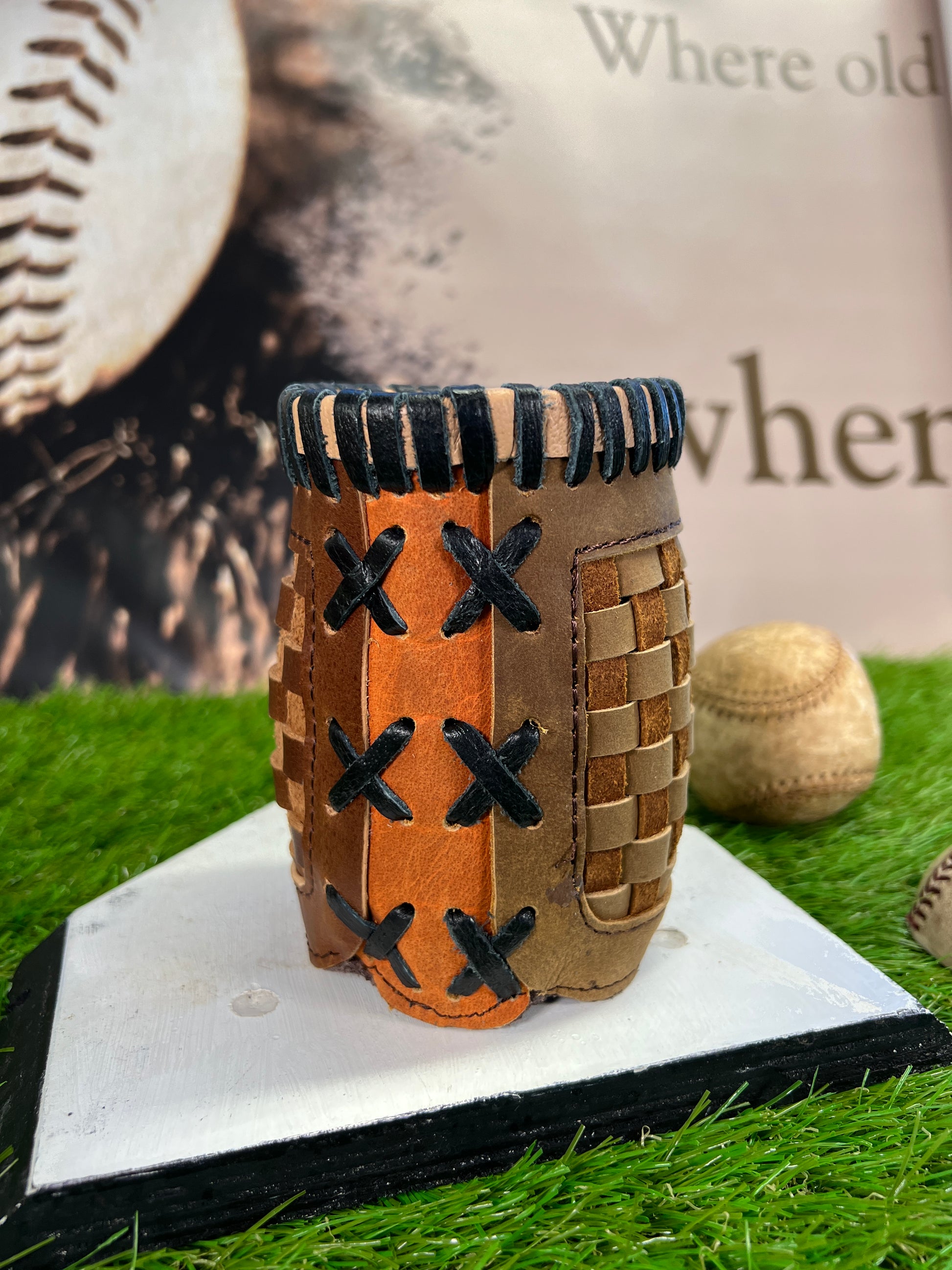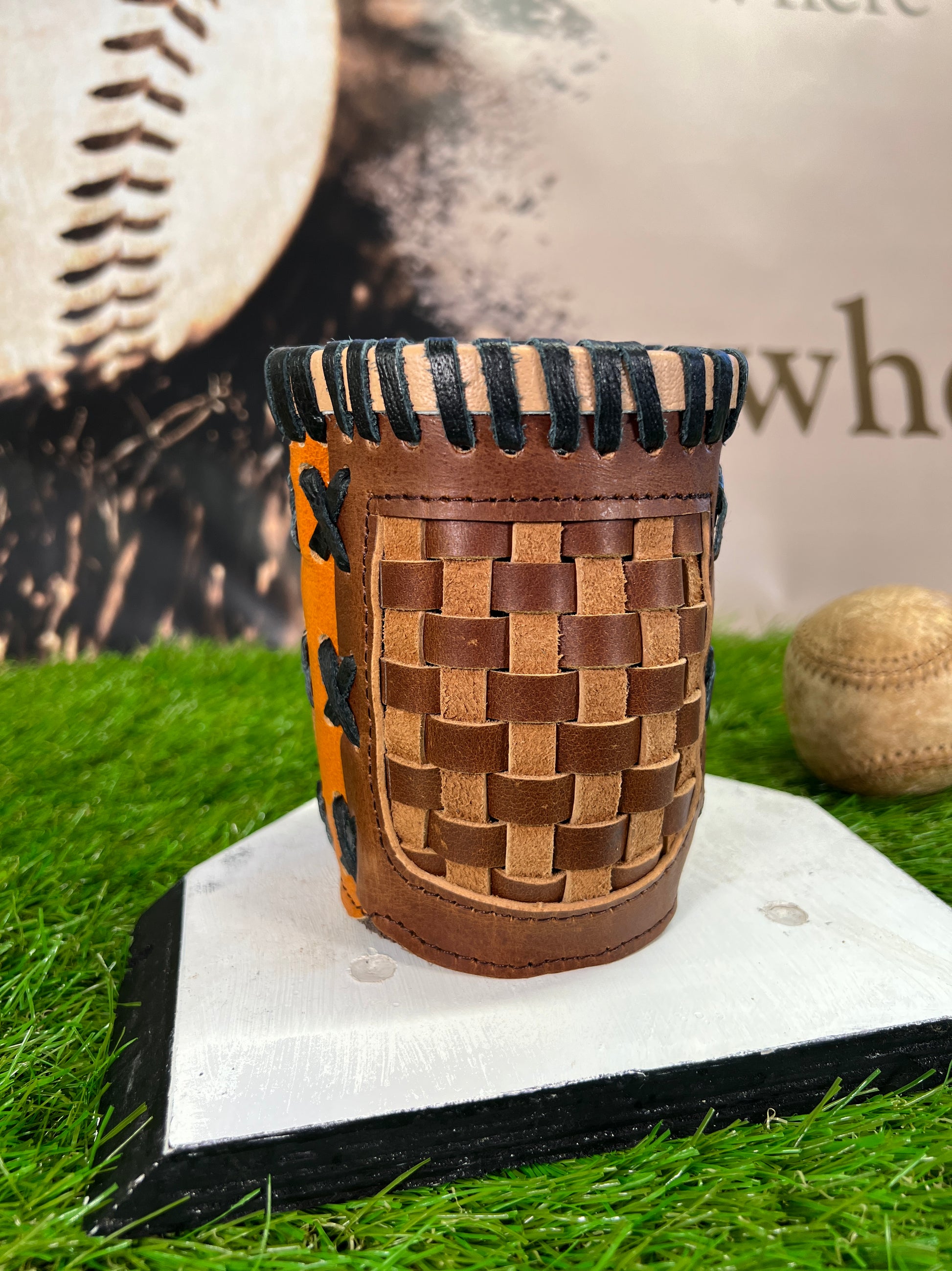 Our latest style of  coozies made from shades of brown and using black laces to assemble.  This coozie is lined with neoprene foam to insulate and keep your drinks cold 100% real leather with a leather sewn bottom. Roomy enough for future options. This leather coozie is just what you need for the upcoming baseball season.