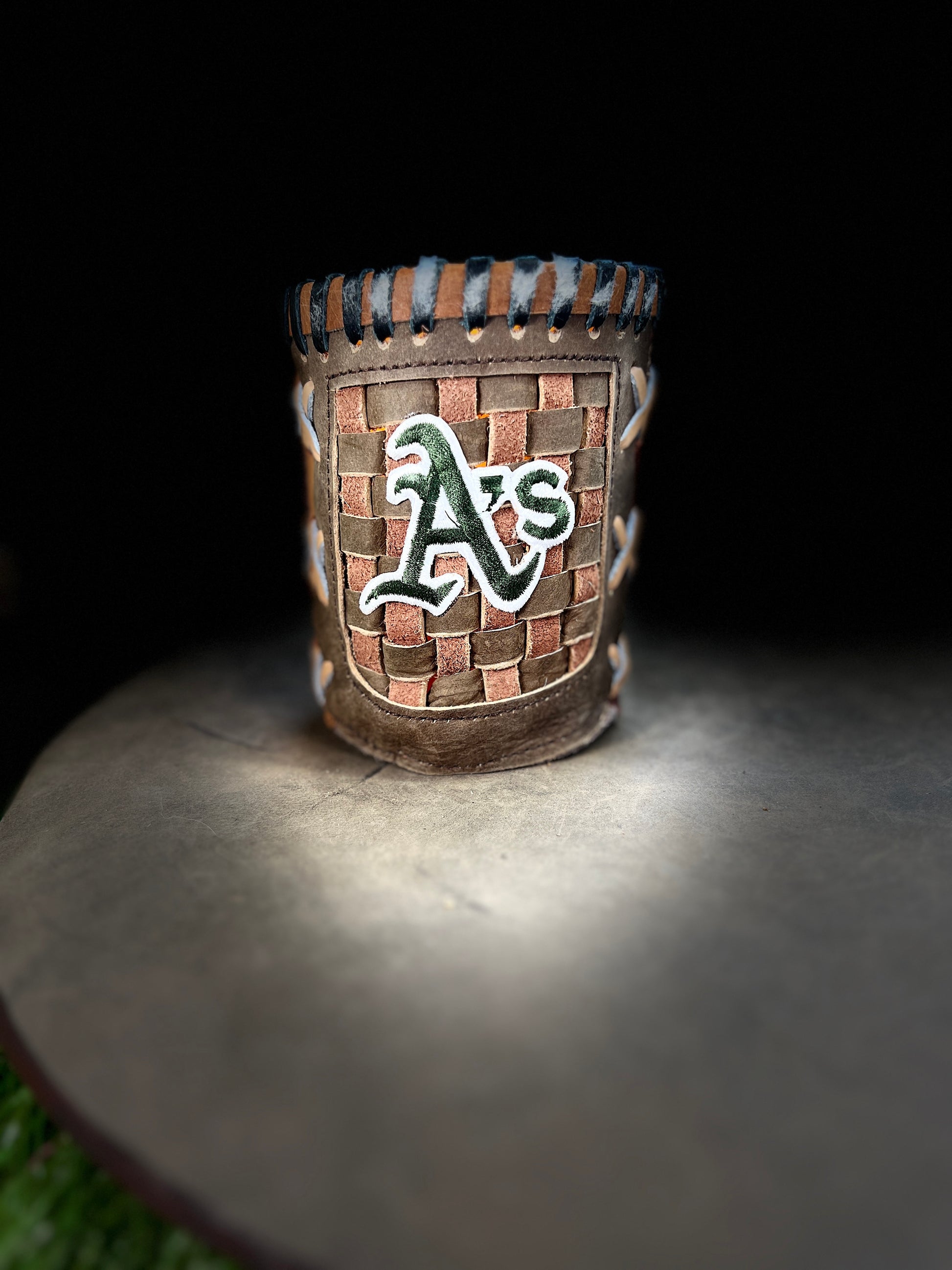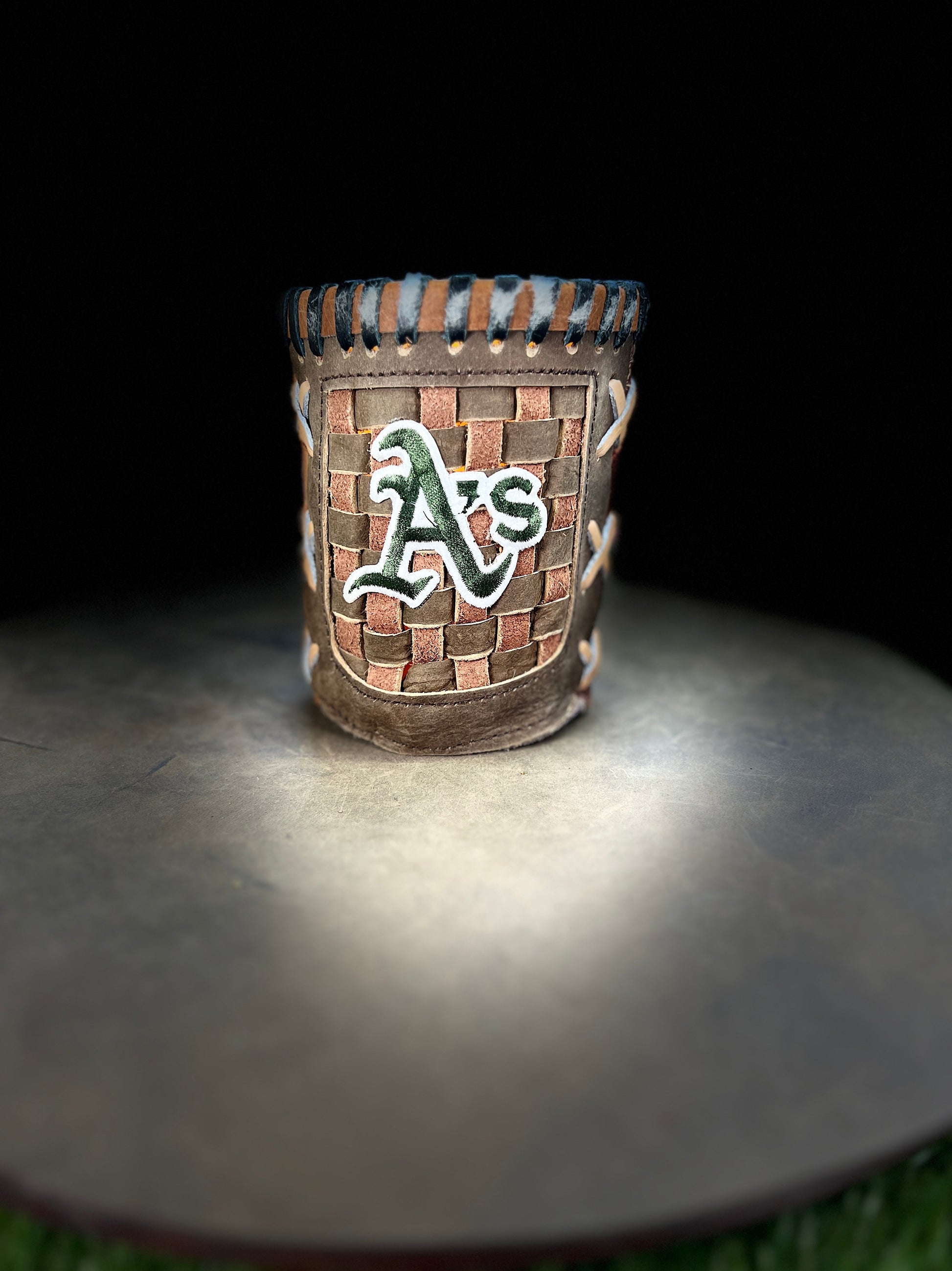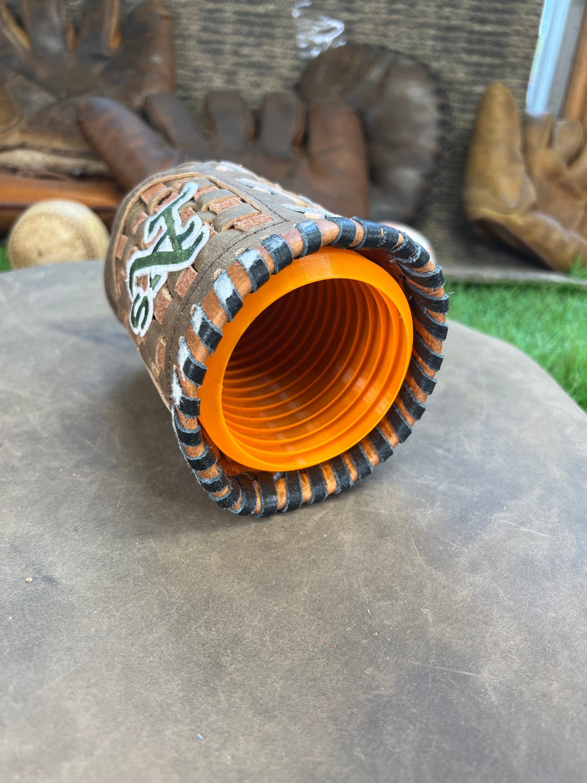 One of our Limited Edition style Coozies. These coozies are our latest design coozie that is 100% leather including the bottom. We make the original baseball pocket coozie and have a design that will last a very long time. We offer the coozies in many different color combinations. We offer coozies plain and in Limited Editions