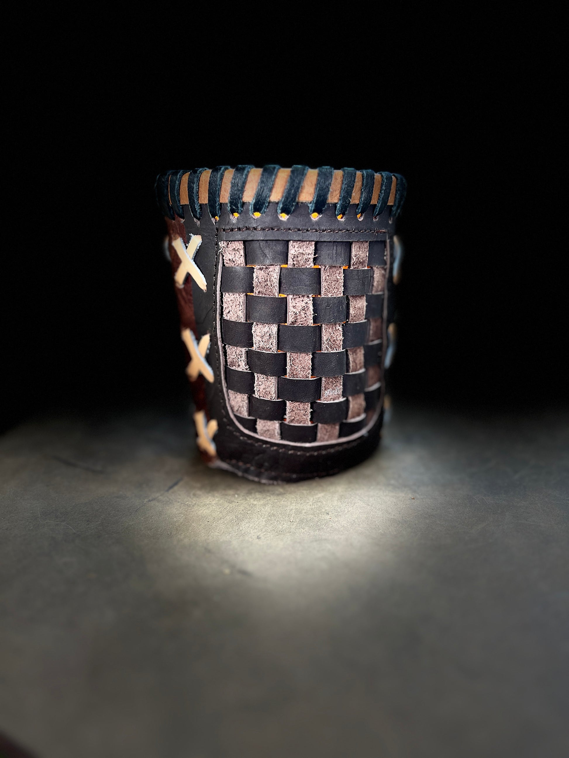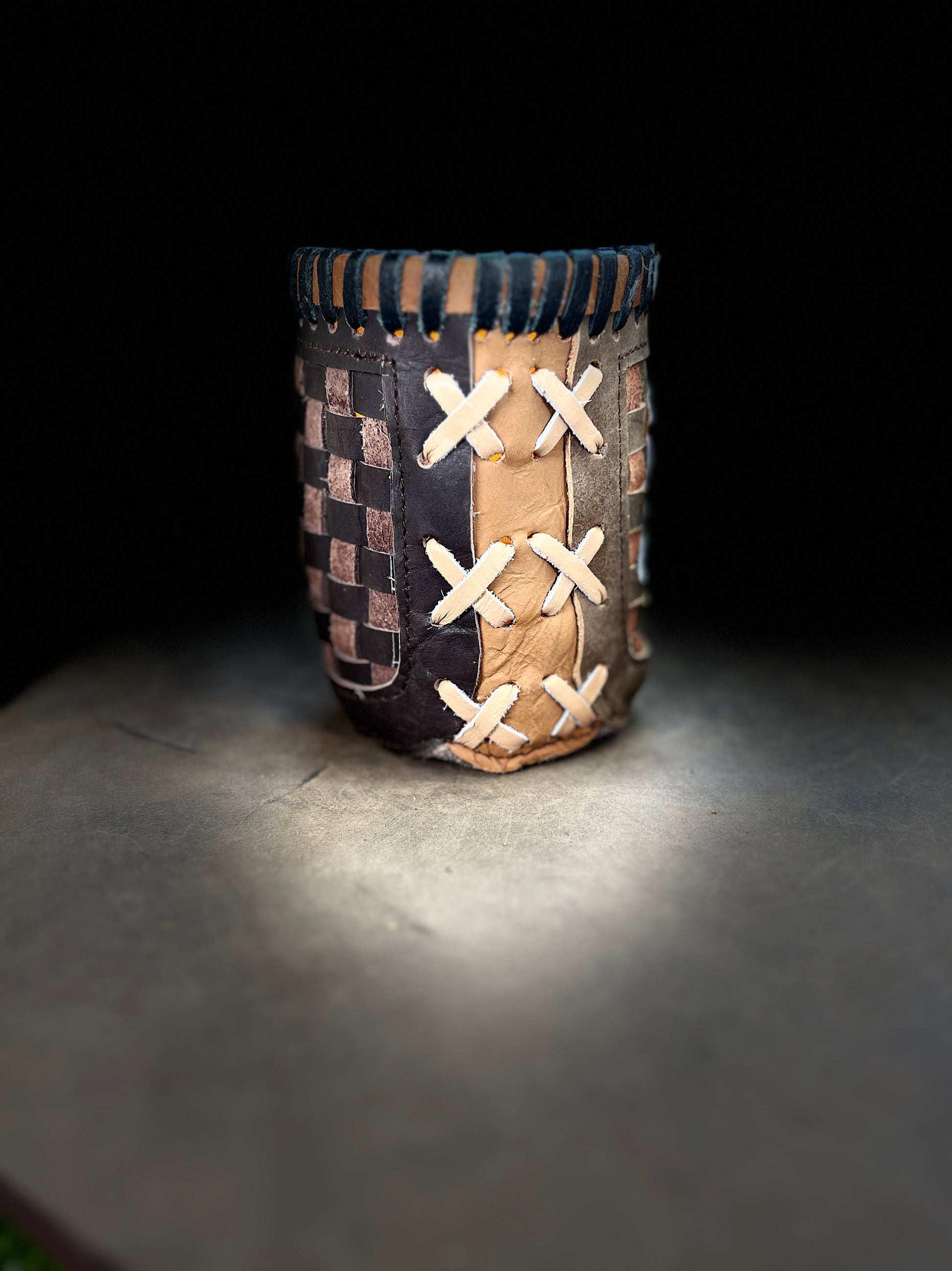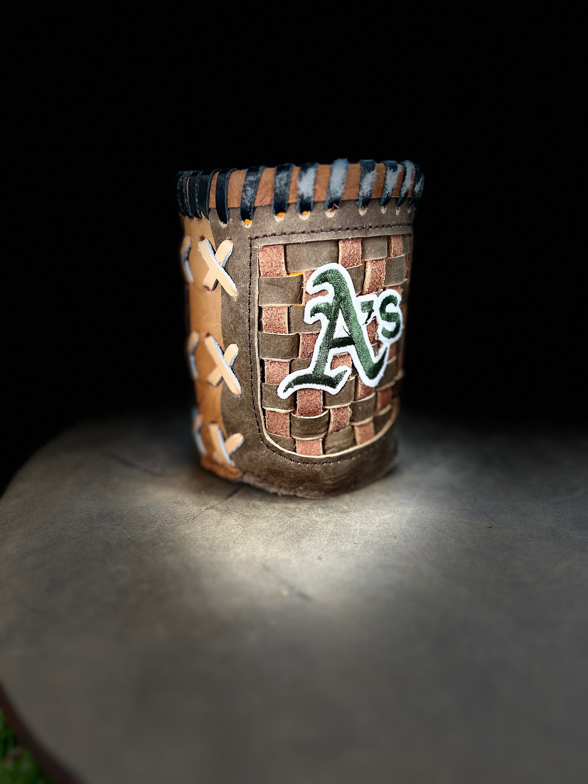 One of our Limited Edition style Coozies. These coozies are our latest design coozie that is 100% leather including the bottom. We make the original baseball pocket coozie and have a design that will last a very long time. We offer the coozies in many different color combinations. We offer coozies plain and in Limited Editions