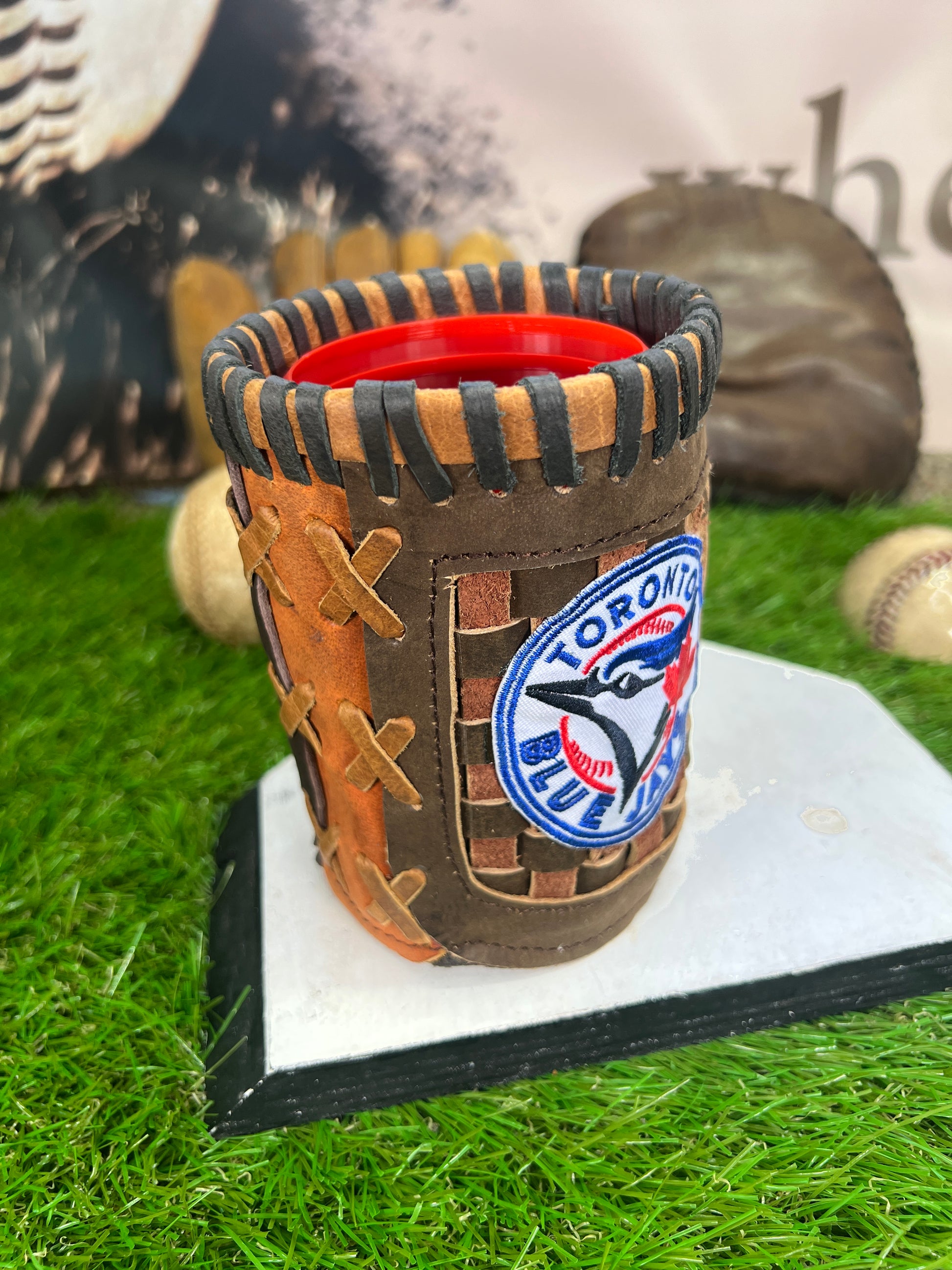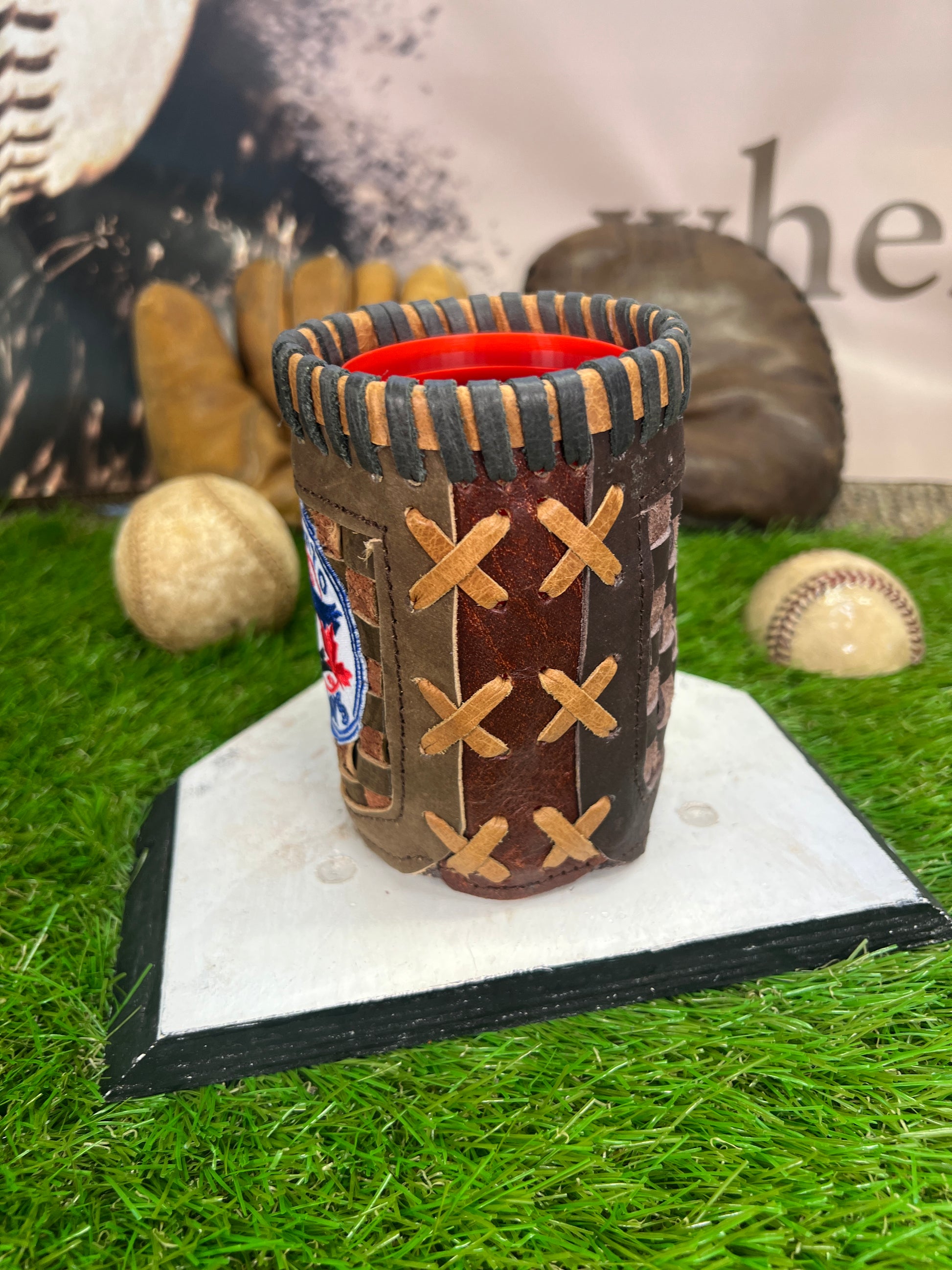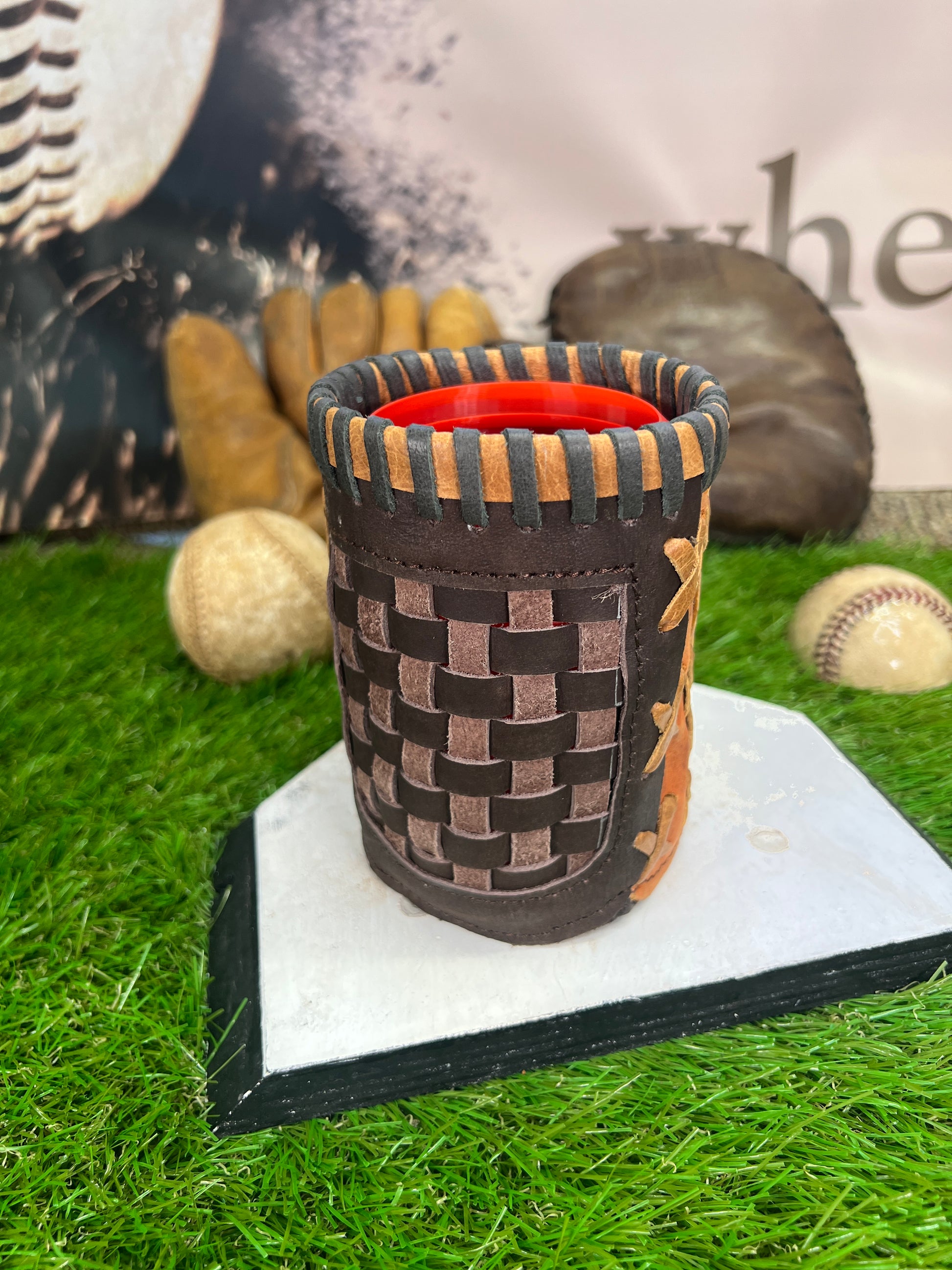 One of our Limited Edition style Coozies. These coozies are our latest design coozie that is 100% leather including the bottom. We make the original baseball pocket coozie and have a design that will last a very long time. We offer the coozies in many different color combinations. We offer coozies plain and in Limited Editions