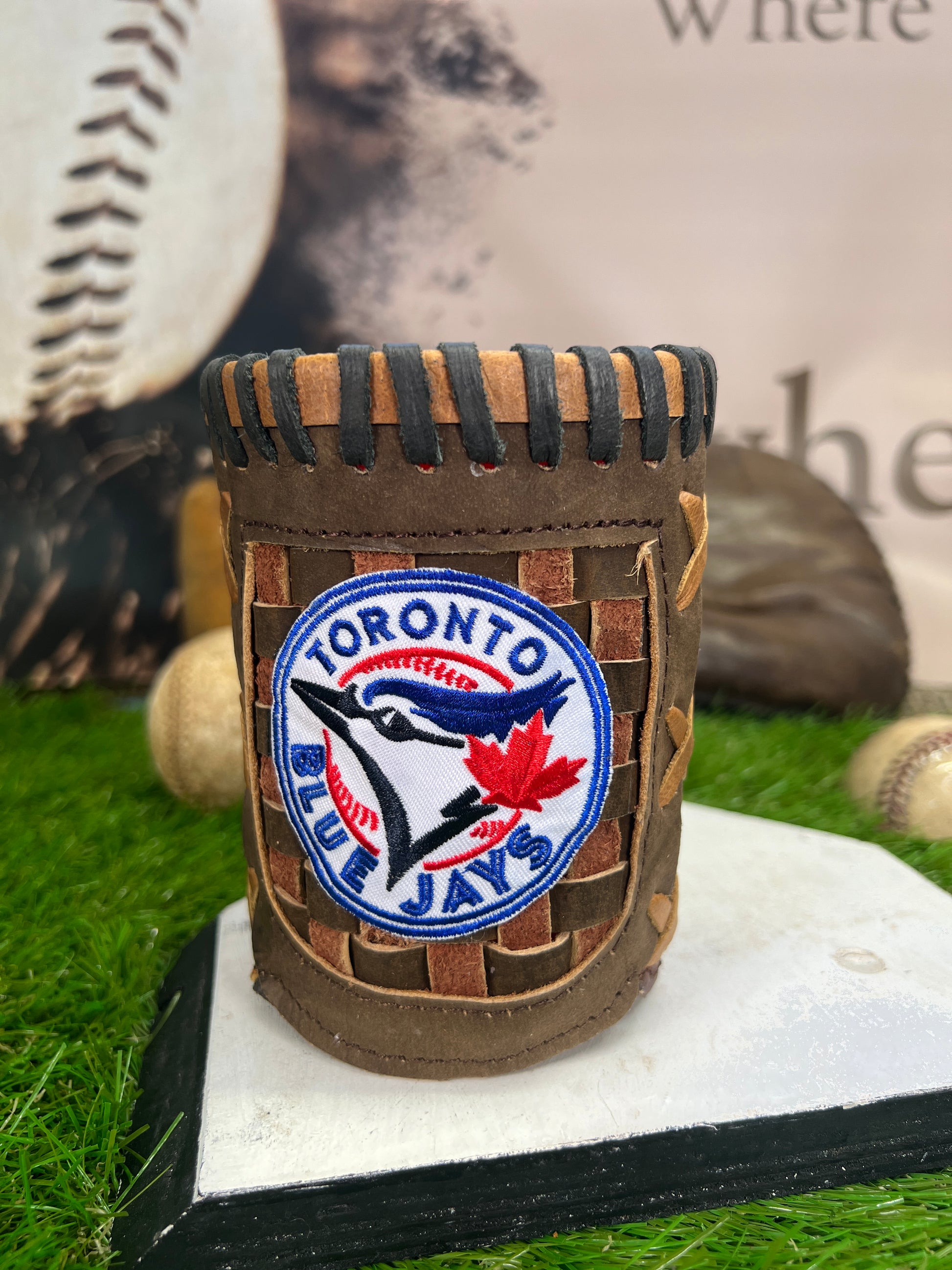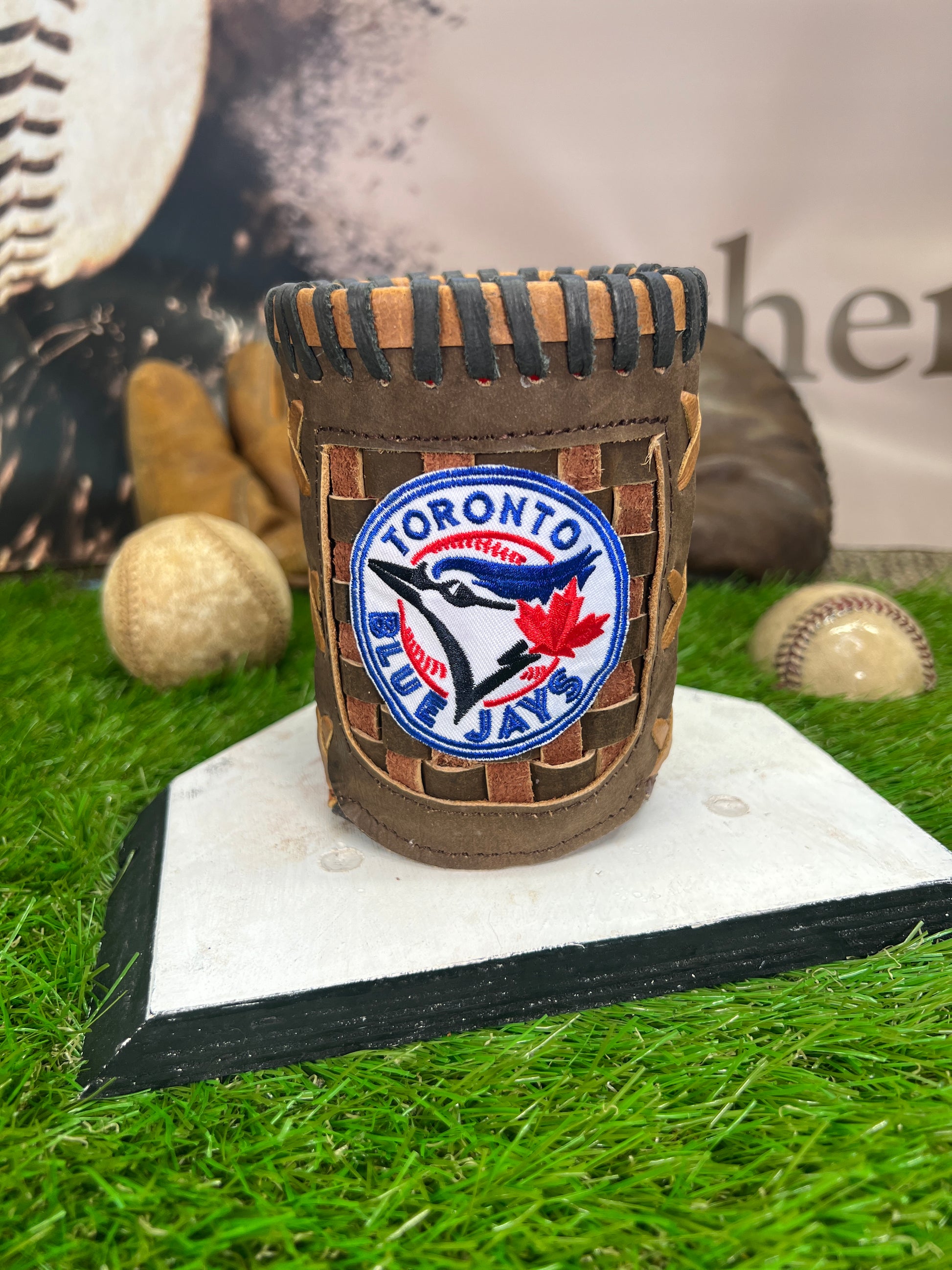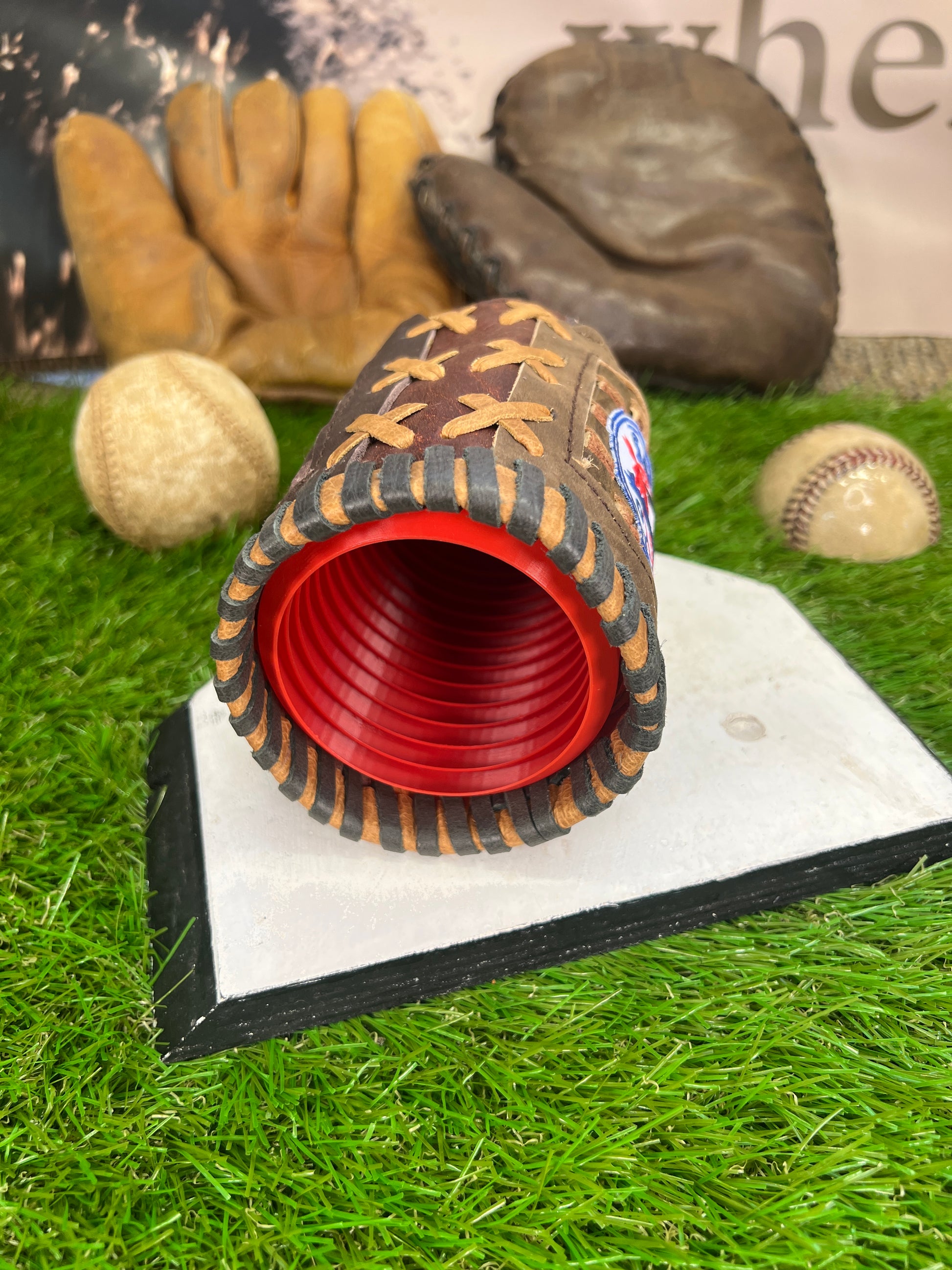 One of our Limited Edition style Coozies. These coozies are our latest design coozie that is 100% leather including the bottom. We make the original baseball pocket coozie and have a design that will last a very long time. We offer the coozies in many different color combinations. We offer coozies plain and in Limited Editions