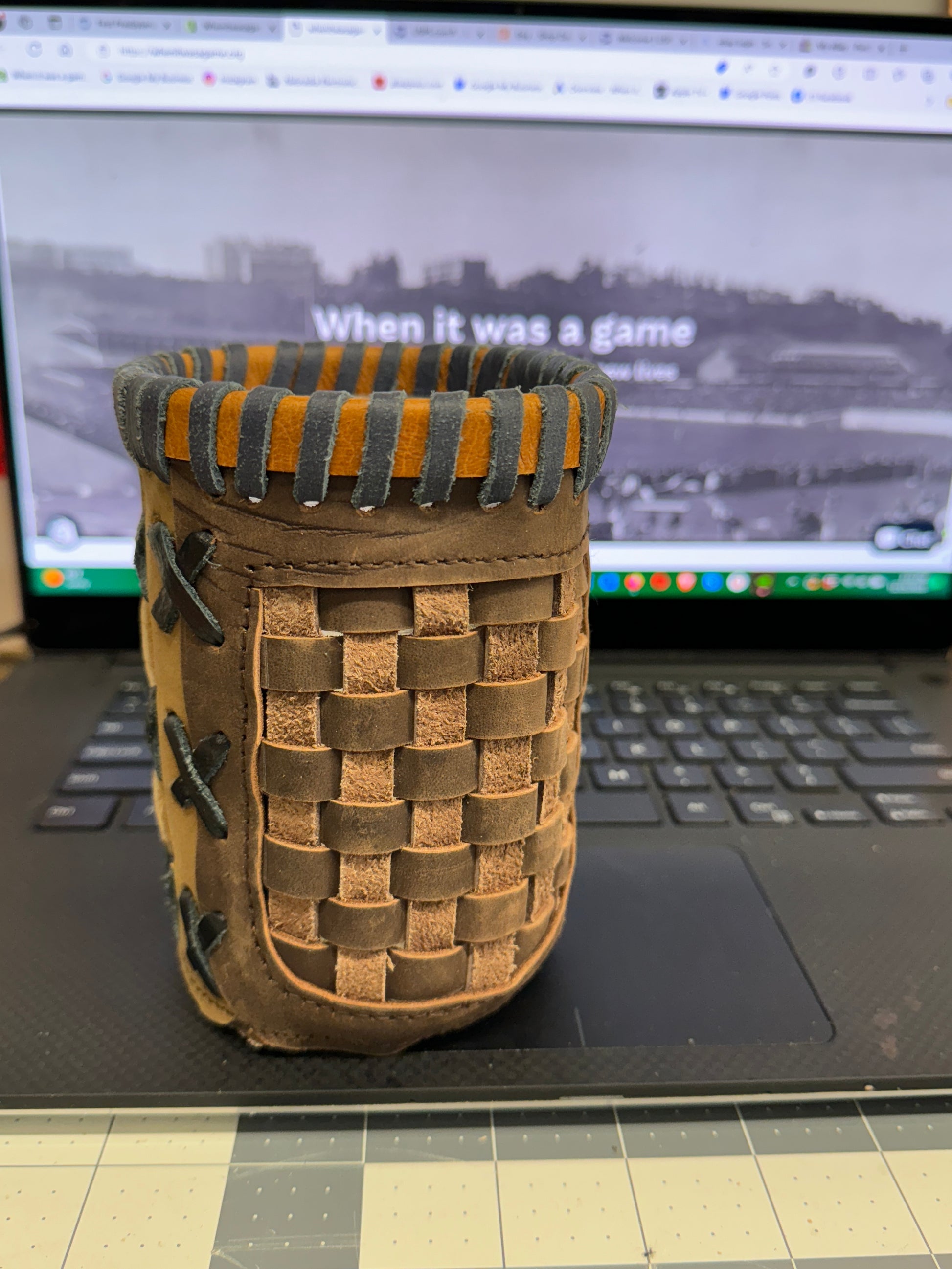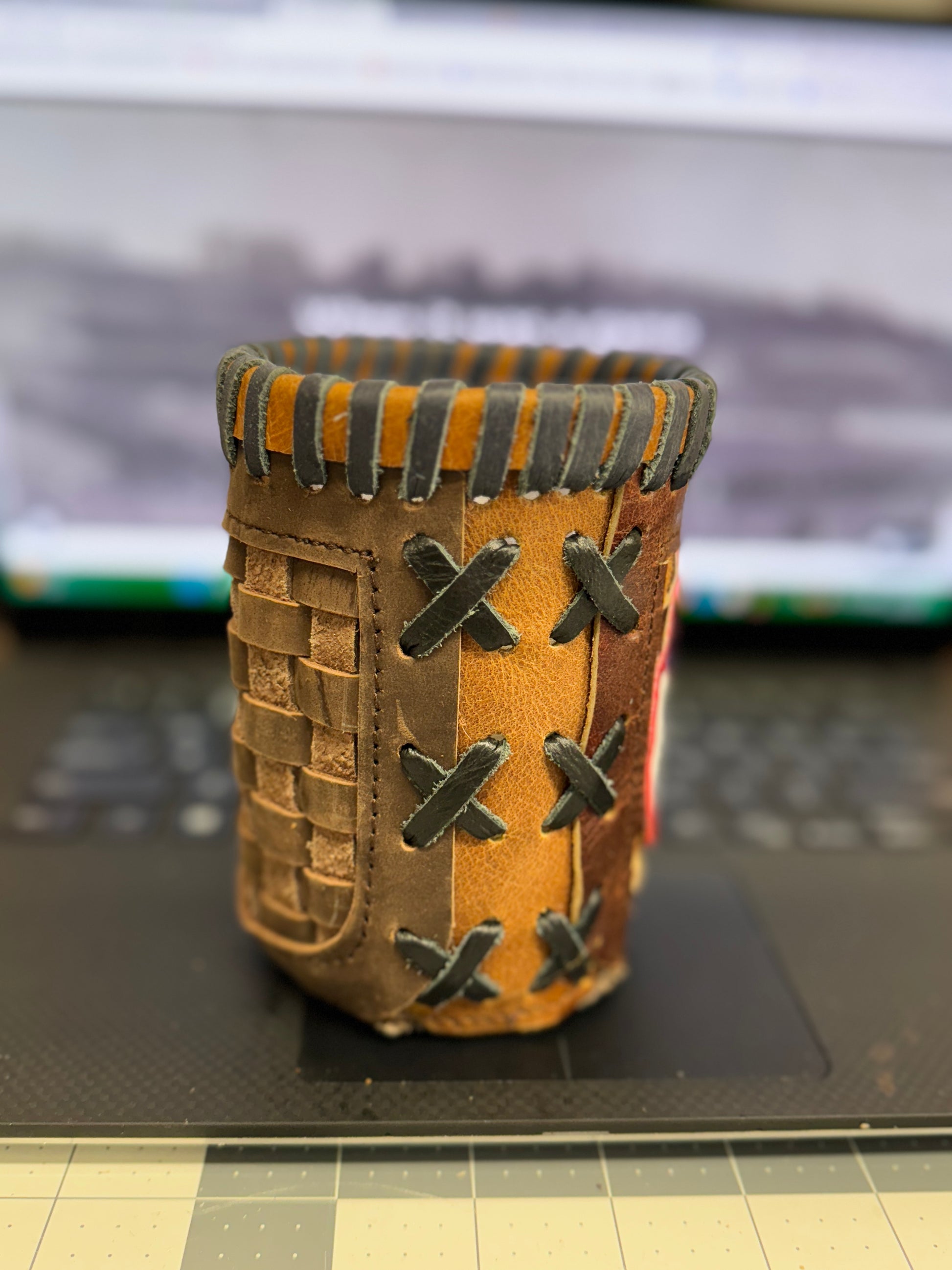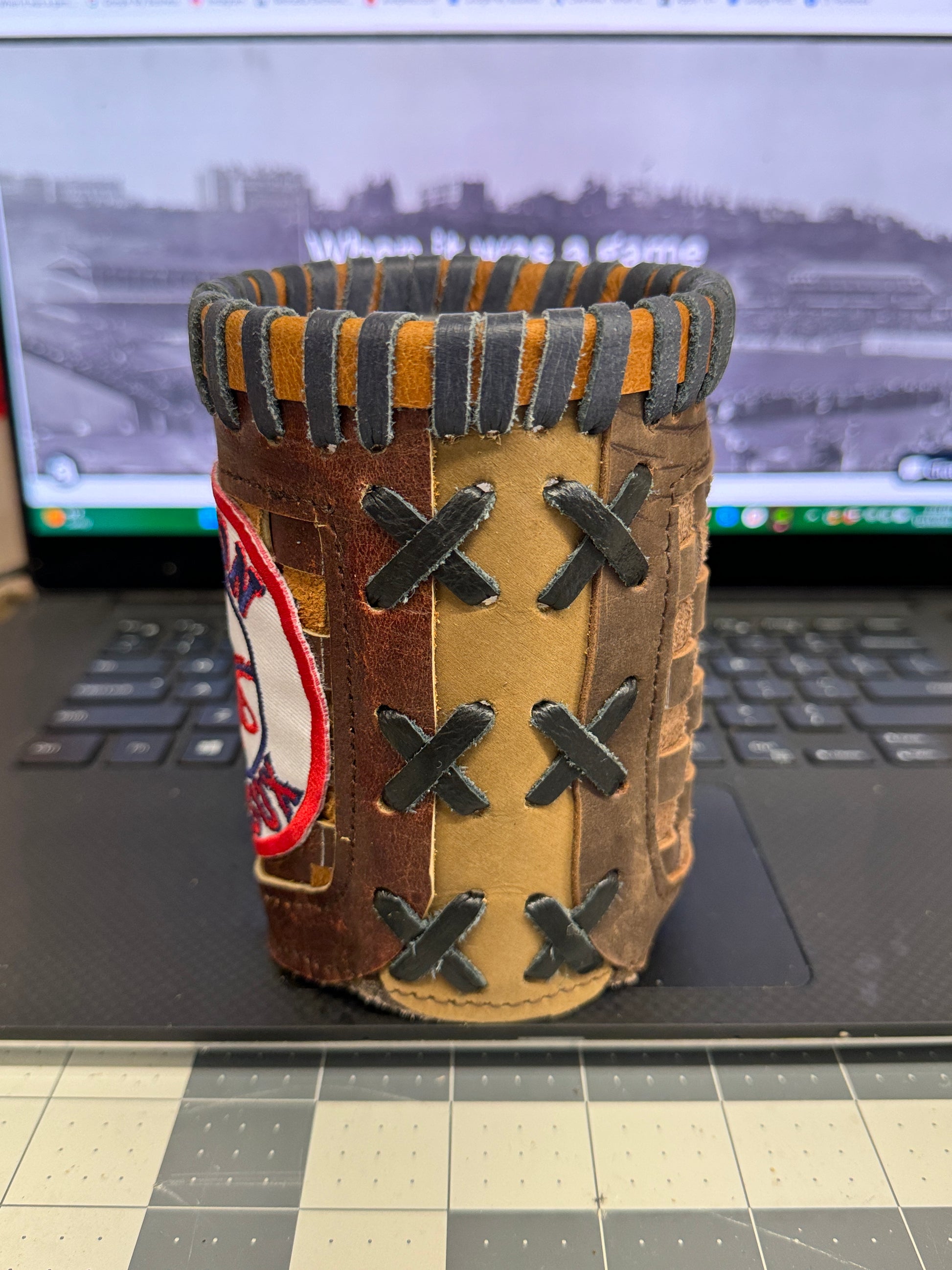 One of our Limited Edition style Cozies. These cozies are our latest design cozie that is 100% leather including the bottom. We make the original baseball pocket coozie and have a design that will last a very long time. We offer the cozies in many different color combinations. We offer coozies plain and in Limited Editions
