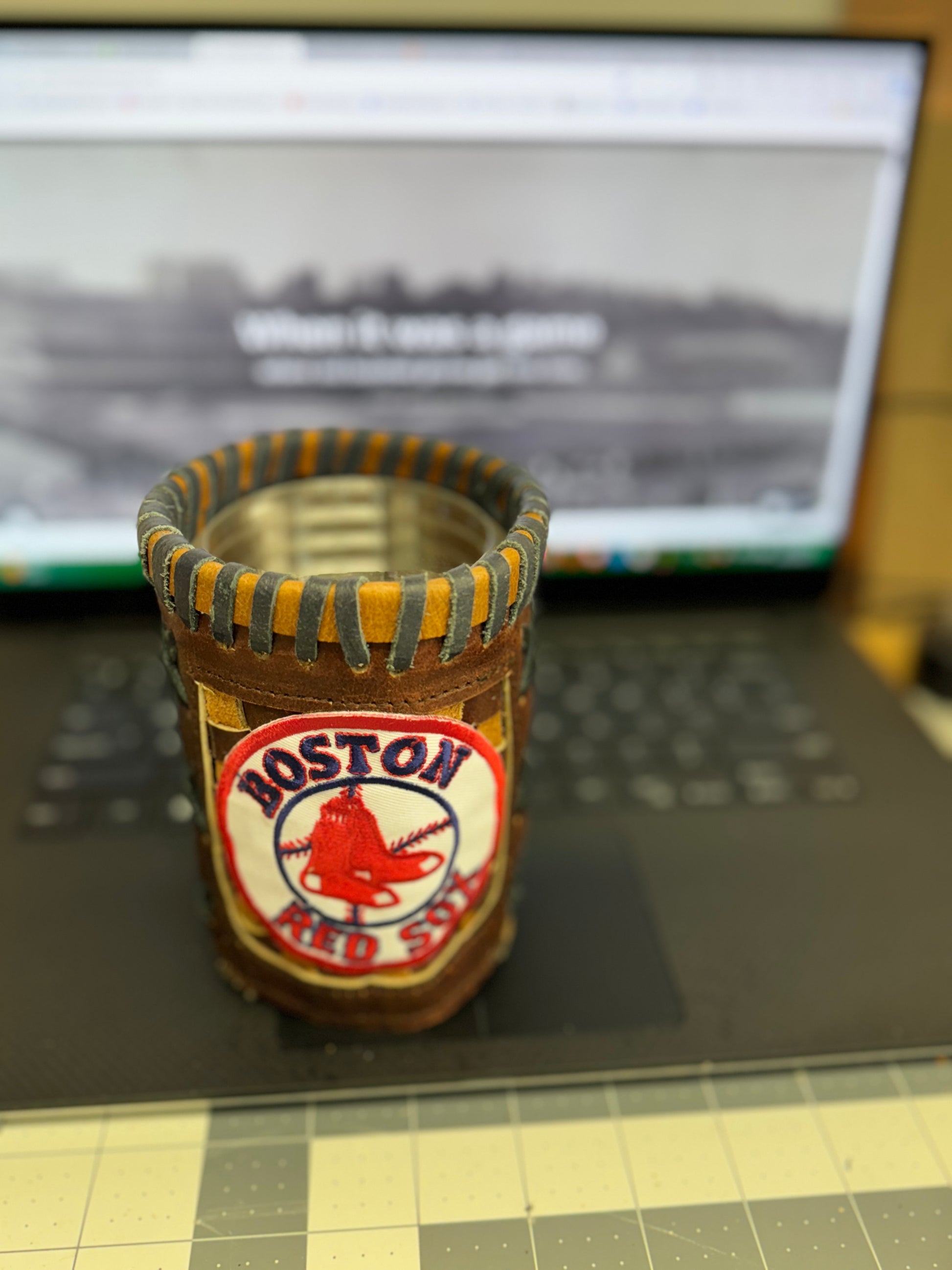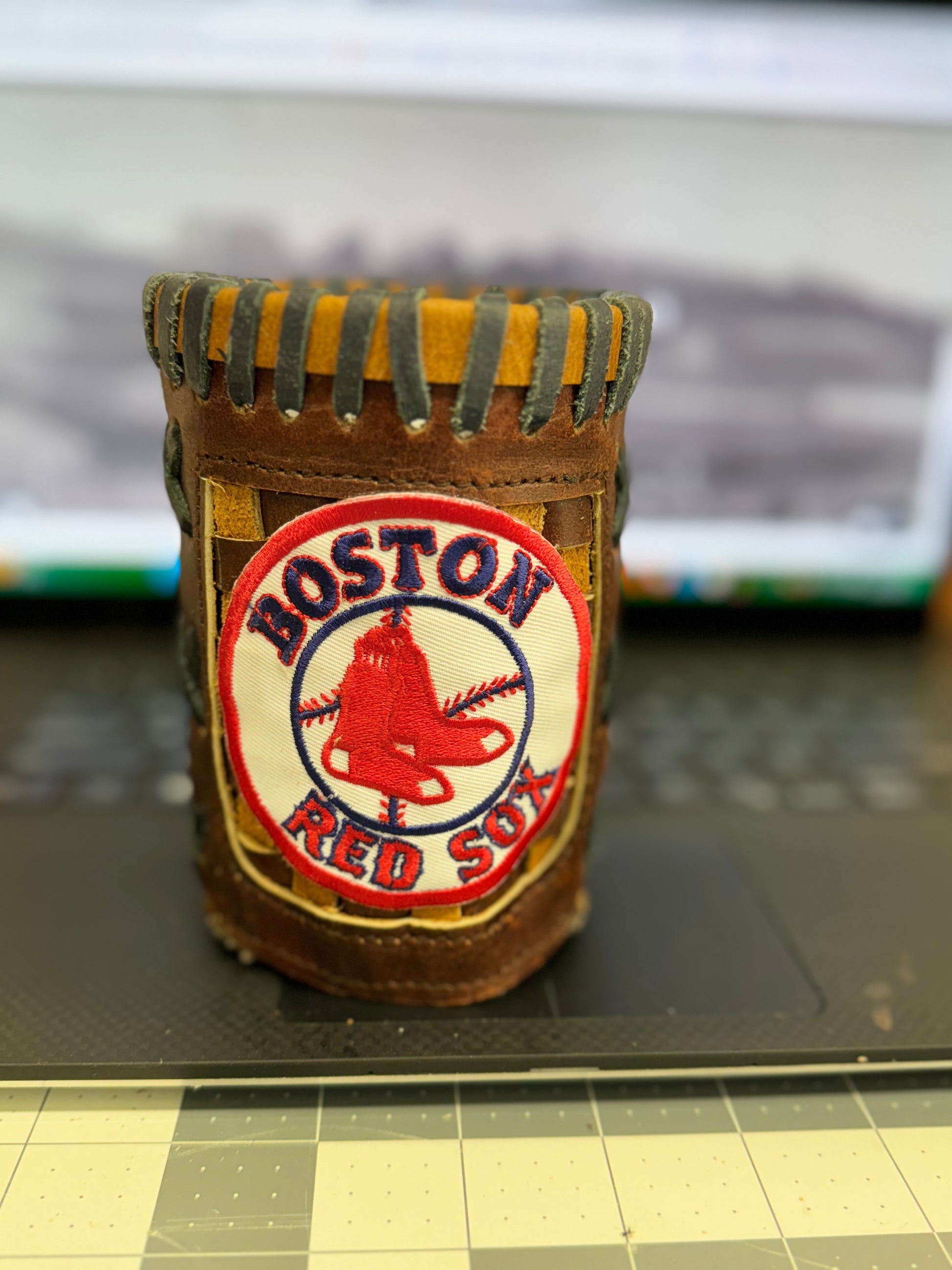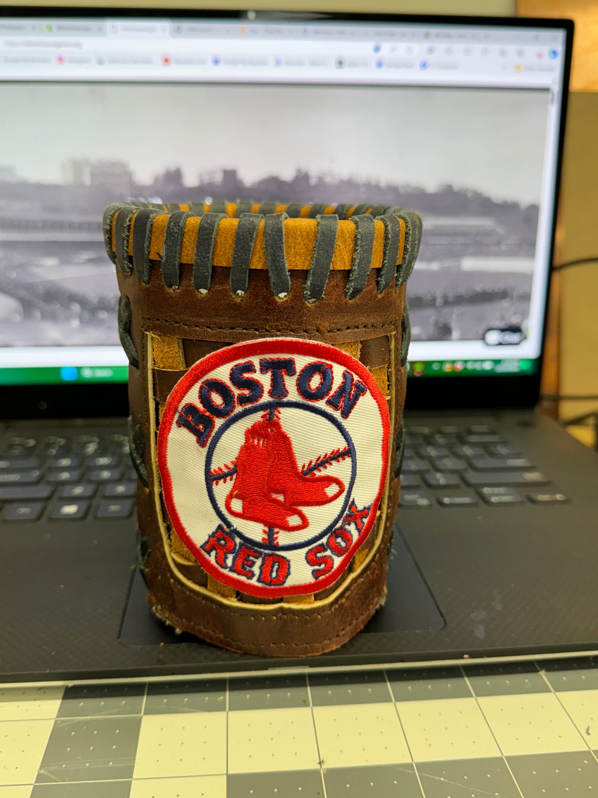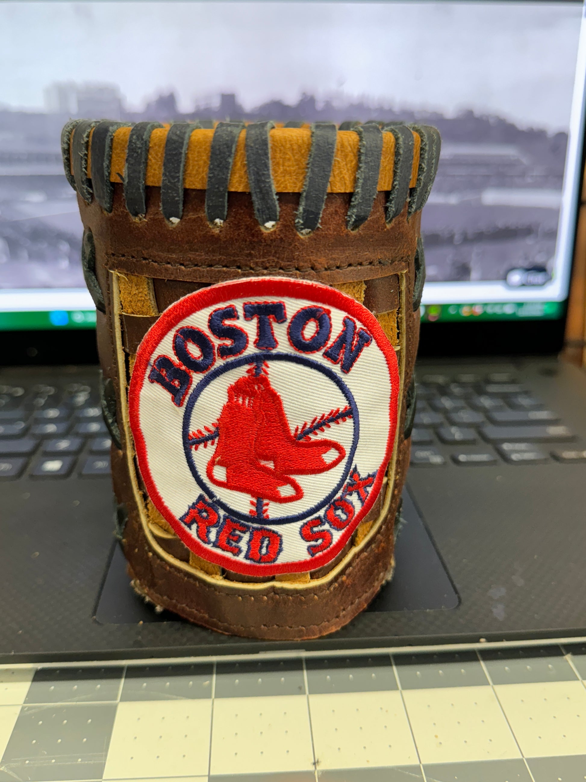 One of our Limited Edition style Cozies. These cozies are our latest design cozie that is 100% leather including the bottom. We make the original baseball pocket coozie and have a design that will last a very long time. We offer the cozies in many different color combinations. We offer coozies plain and in Limited Editions