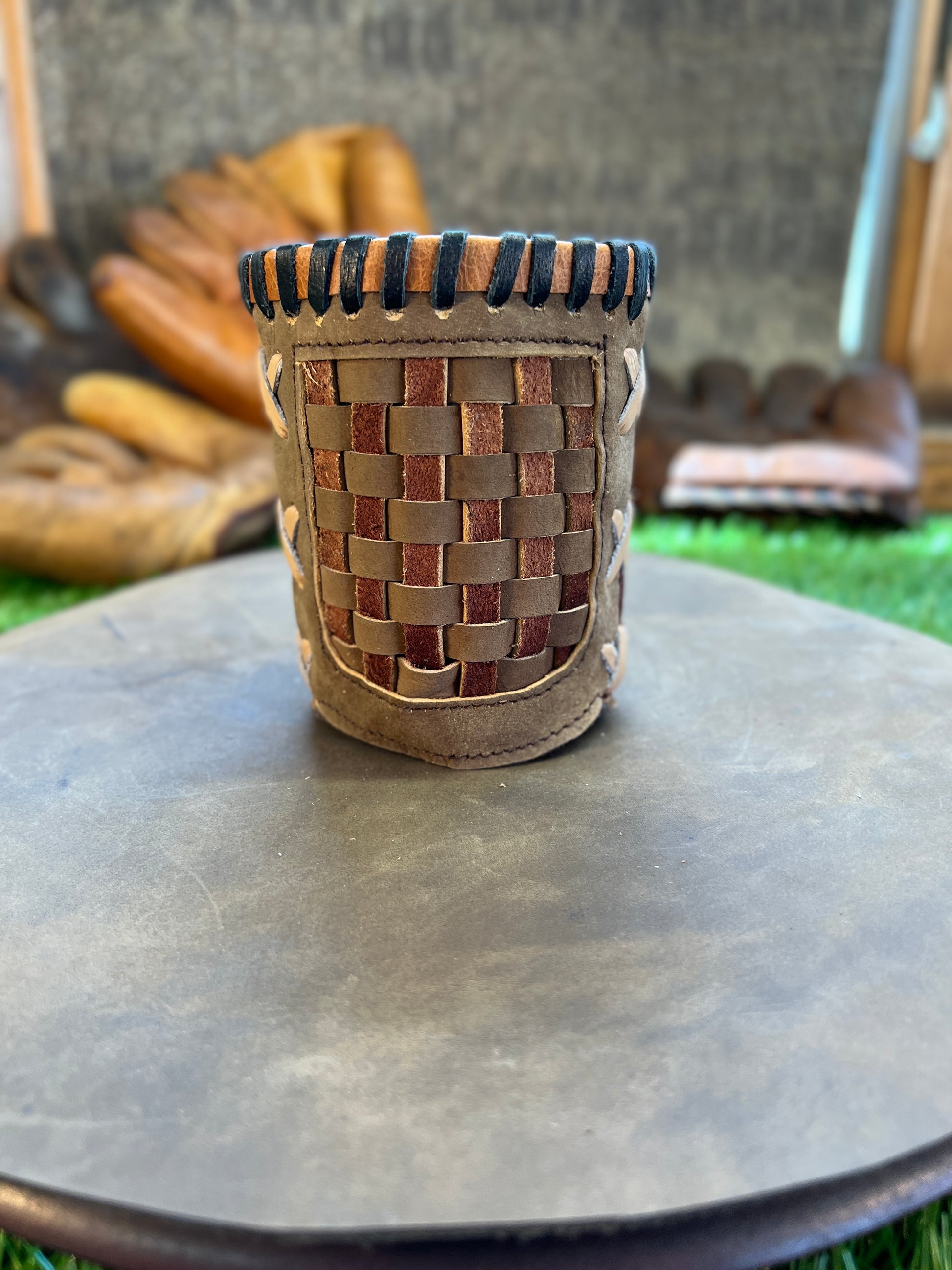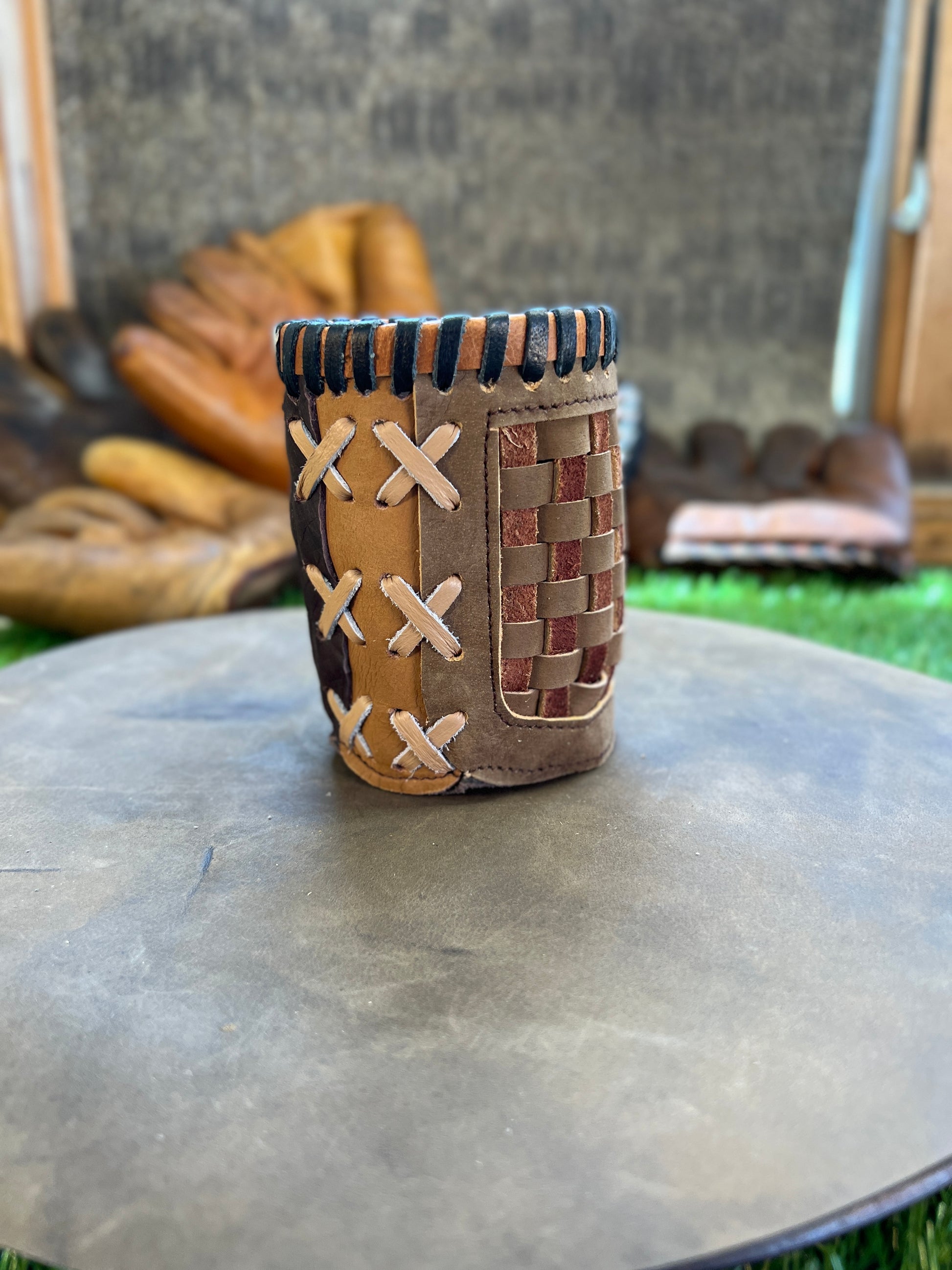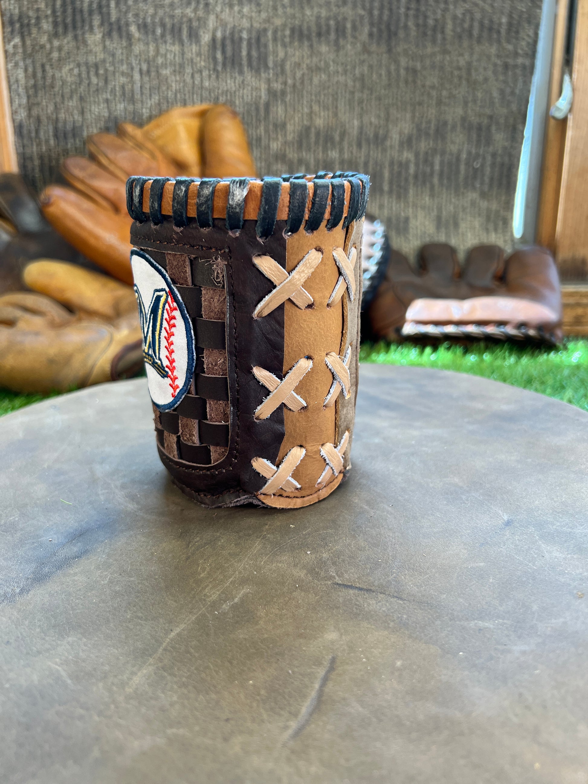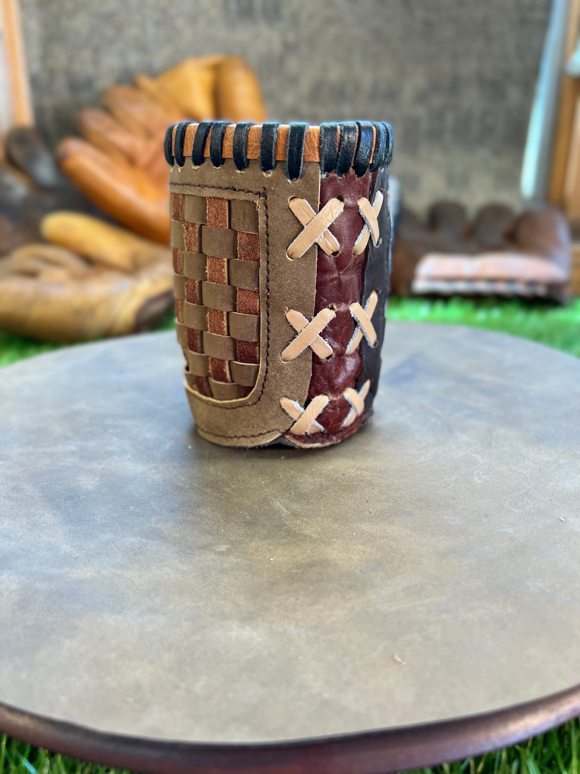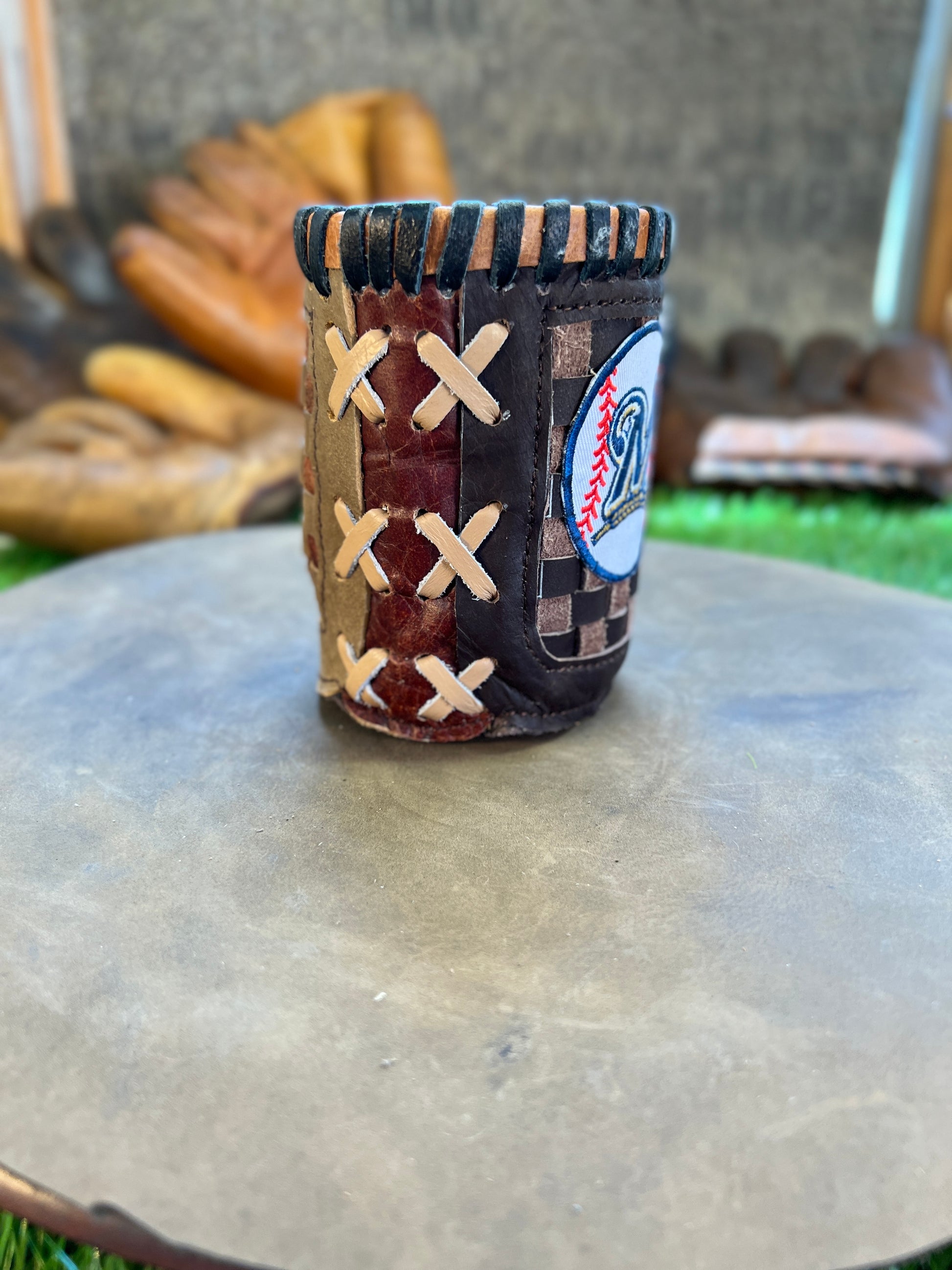 One of our Limited Edition style Coozies. These coozies are our latest design coozie that is 100% leather including the bottom. We make the original baseball pocket coozie and have a design that will last a very long time. We offer the coozies in many different color combinations. We offer coozies plain and in Limited Editions
