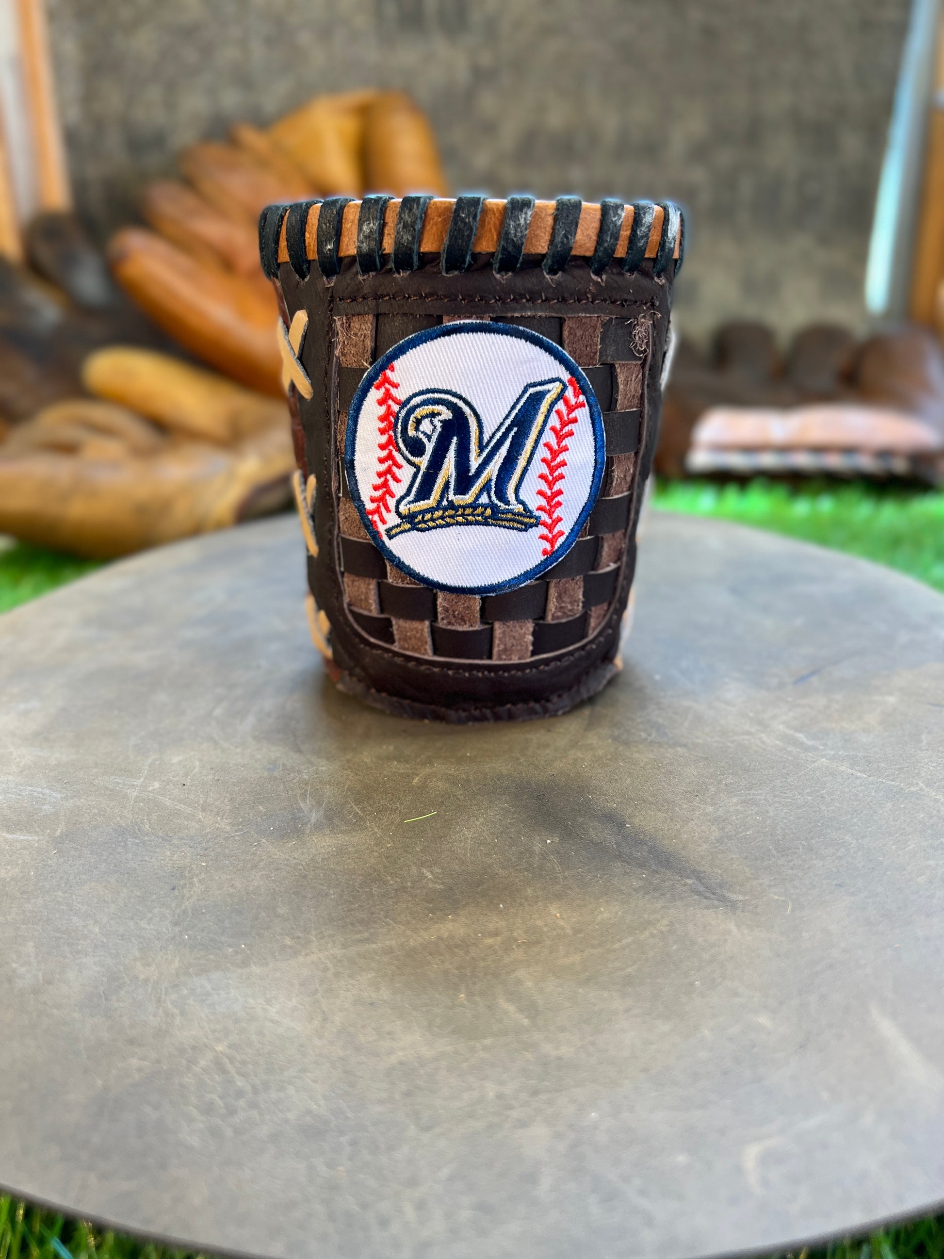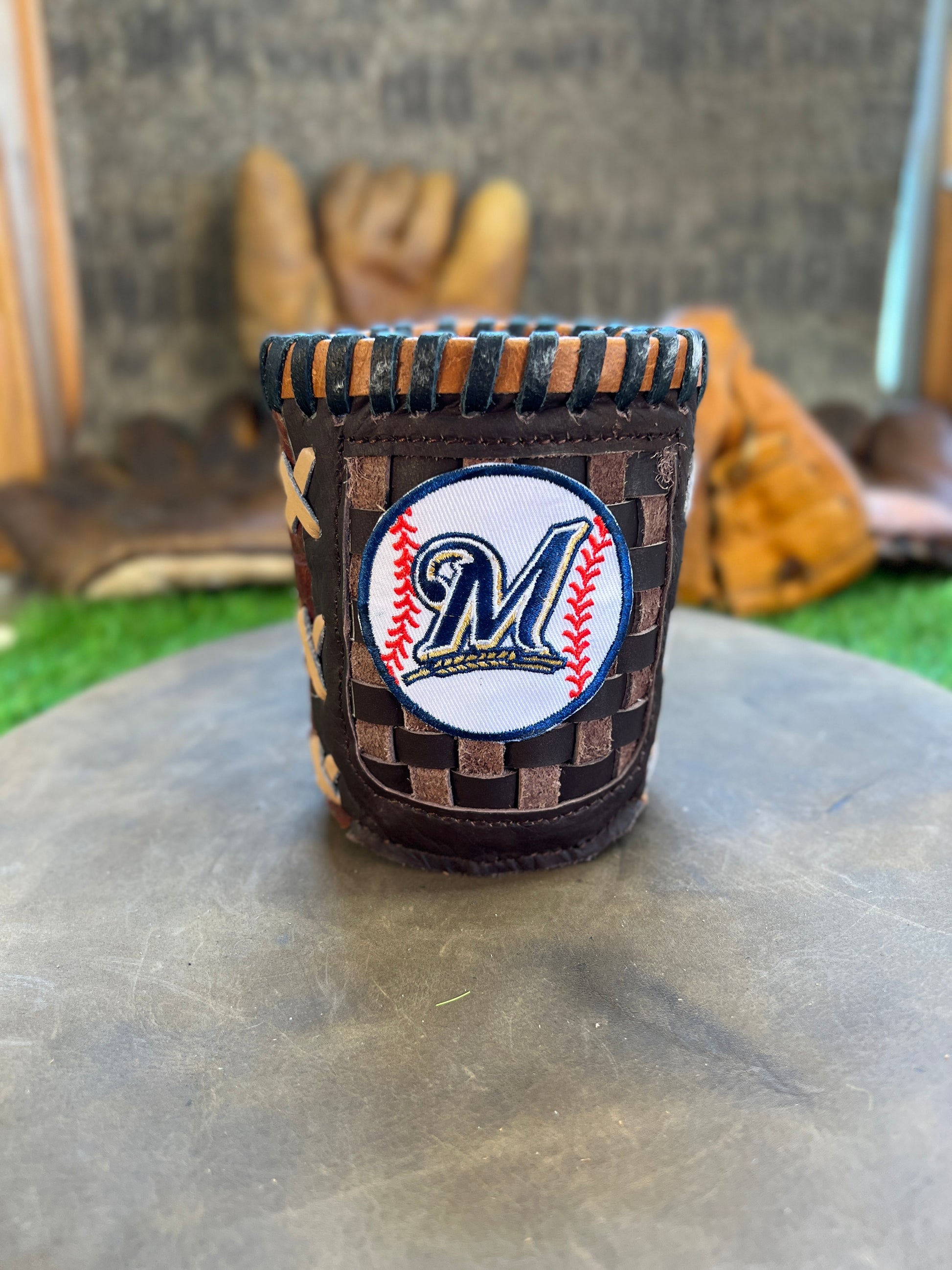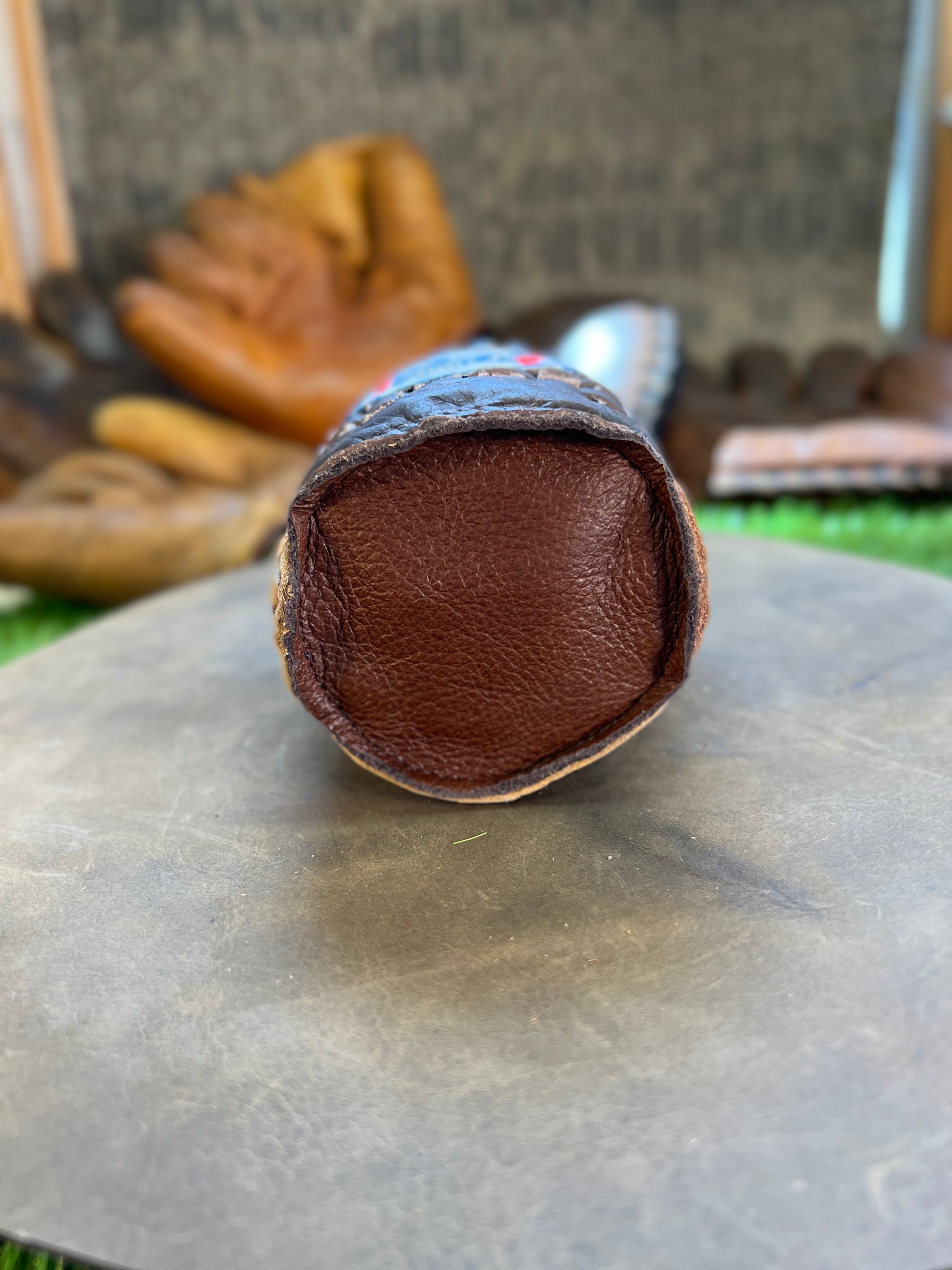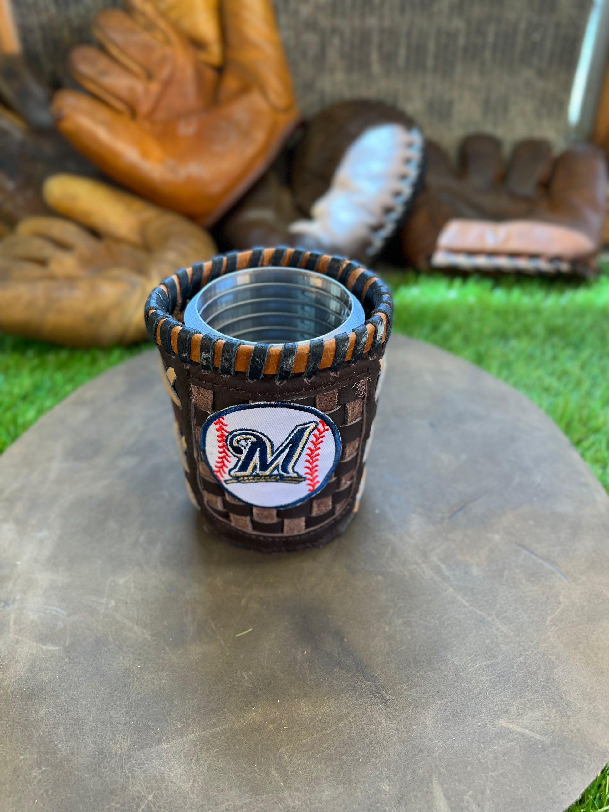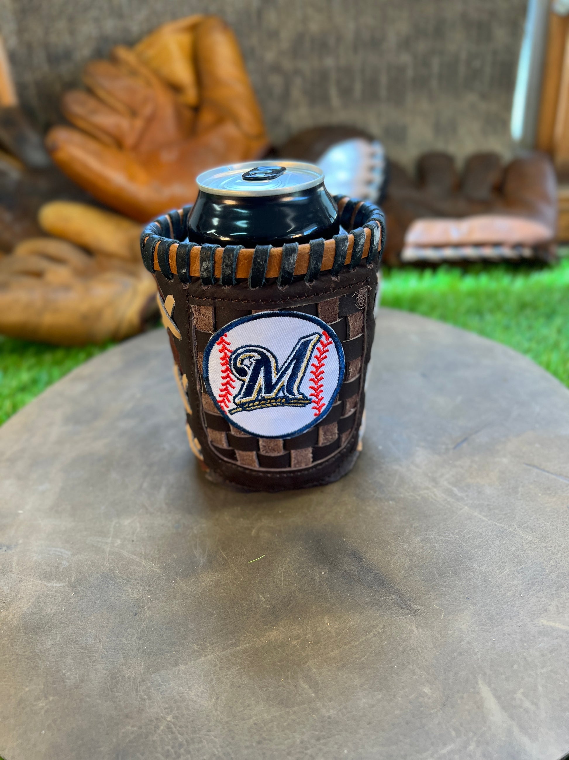 One of our Limited Edition style Coozies. These coozies are our latest design coozie that is 100% leather including the bottom. We make the original baseball pocket coozie and have a design that will last a very long time. We offer the coozies in many different color combinations. We offer coozies plain and in Limited Editions