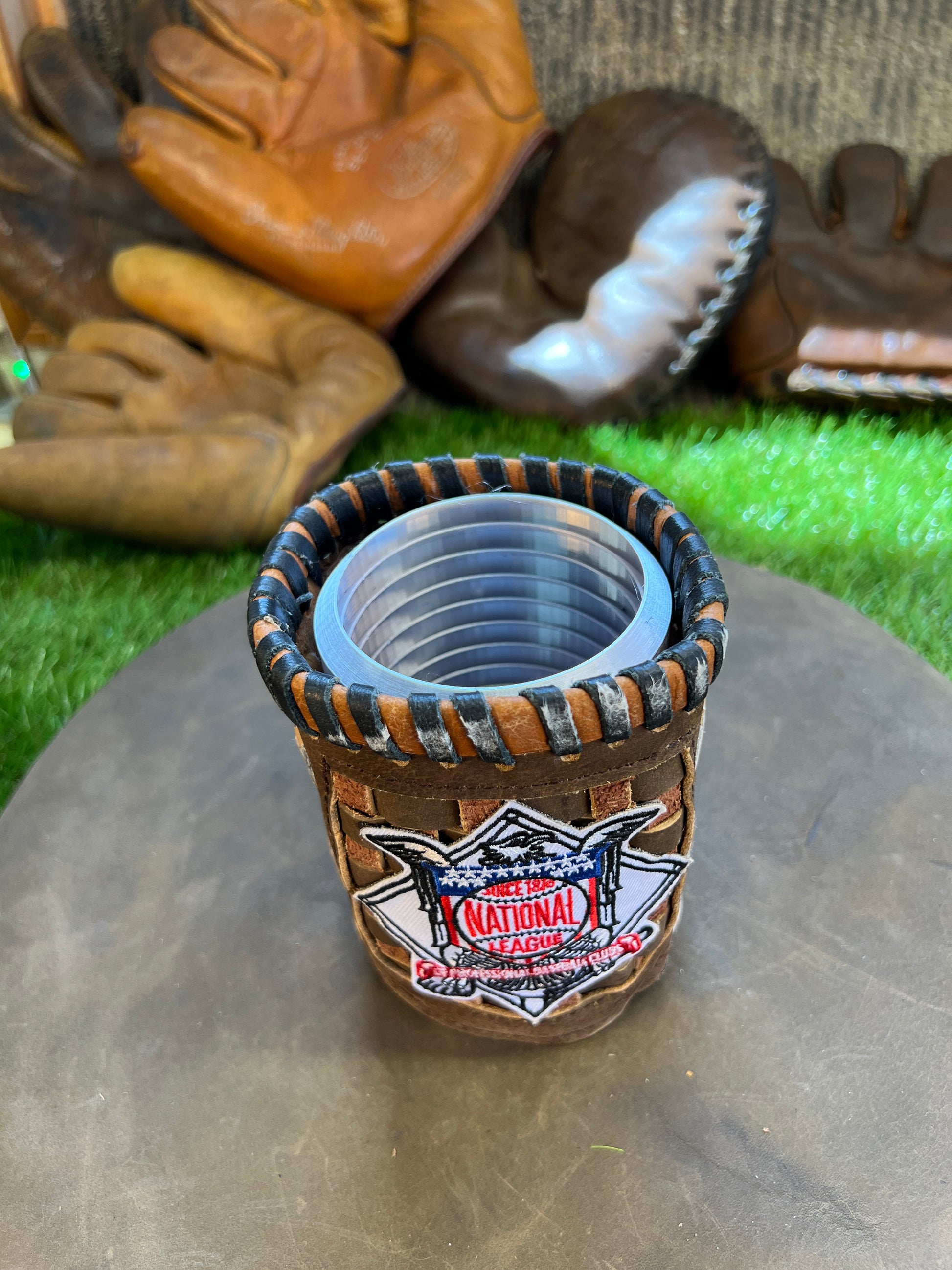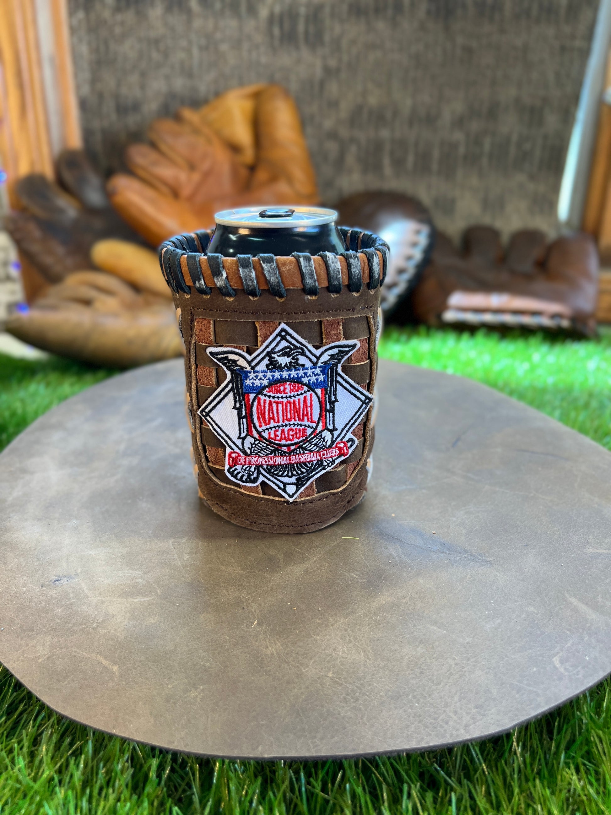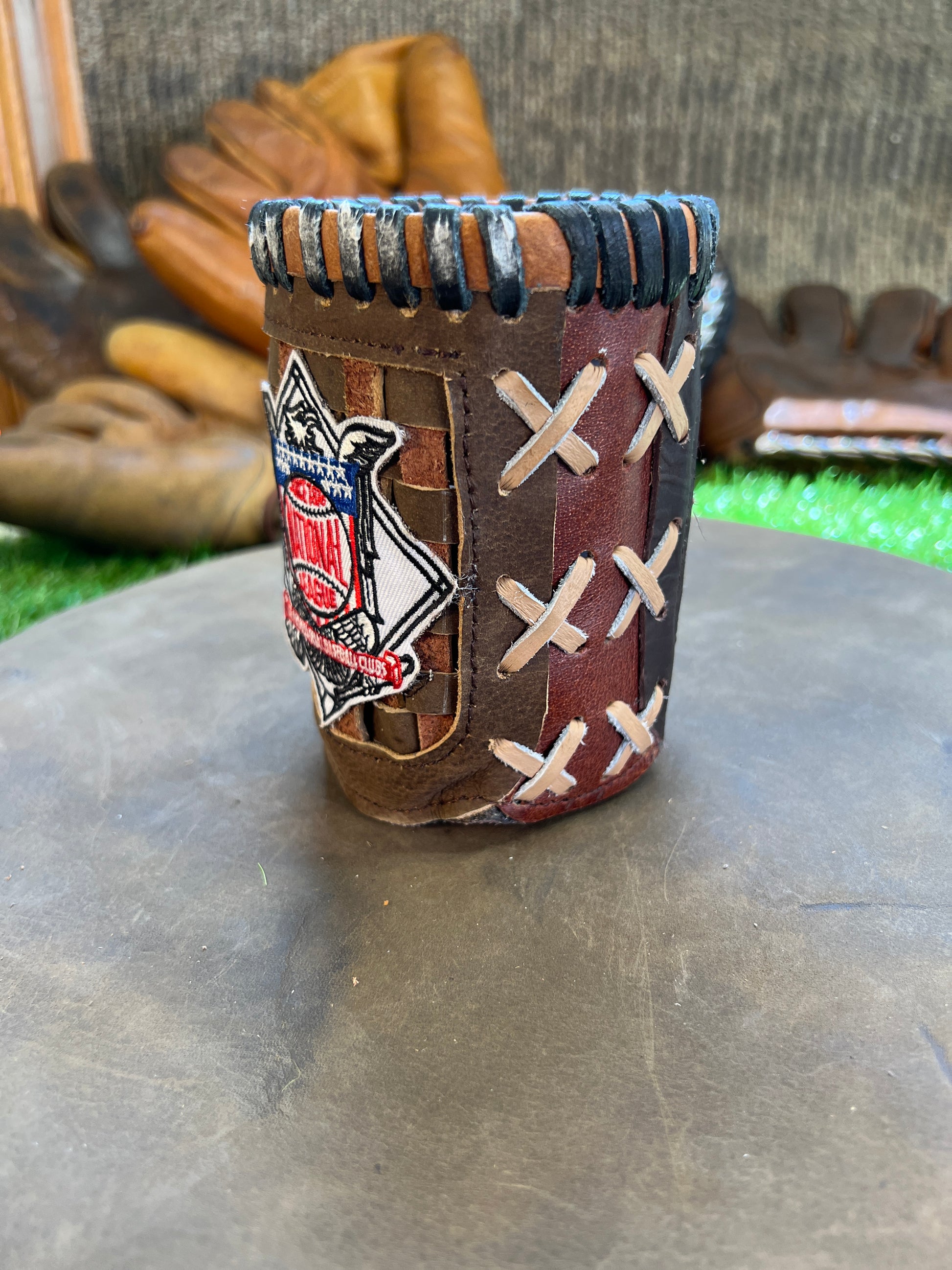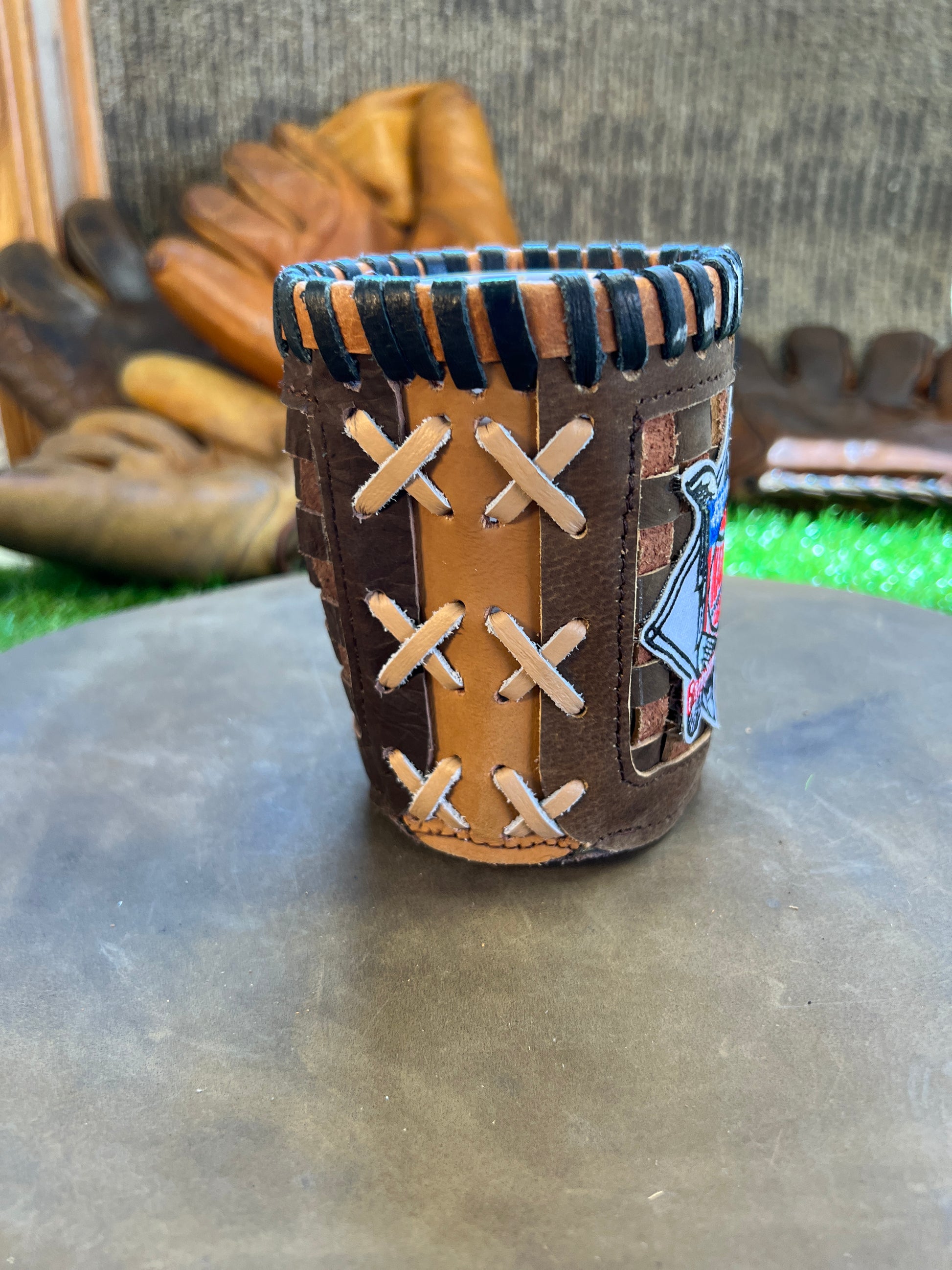 One of our Limited Edition style Coozies. These coozies are our latest design coozie that is 100% leather including the bottom. We make the original baseball pocket coozie and have a design that will last a very long time. We offer the coozies in many different color combinations. We offer coozies plain and in Limited Editions